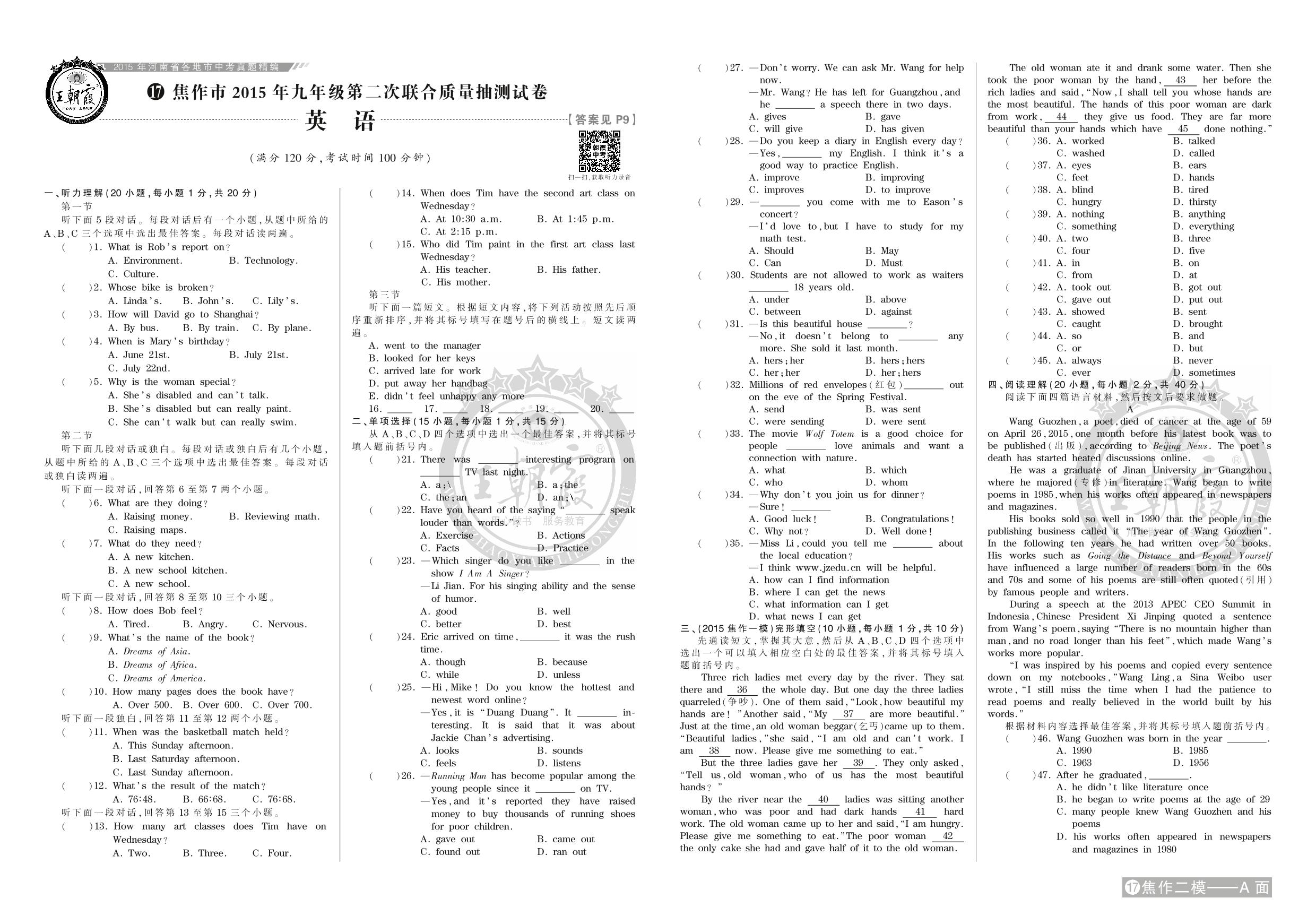 焦作市2015年九年级第二次联合质量抽测试卷【17】