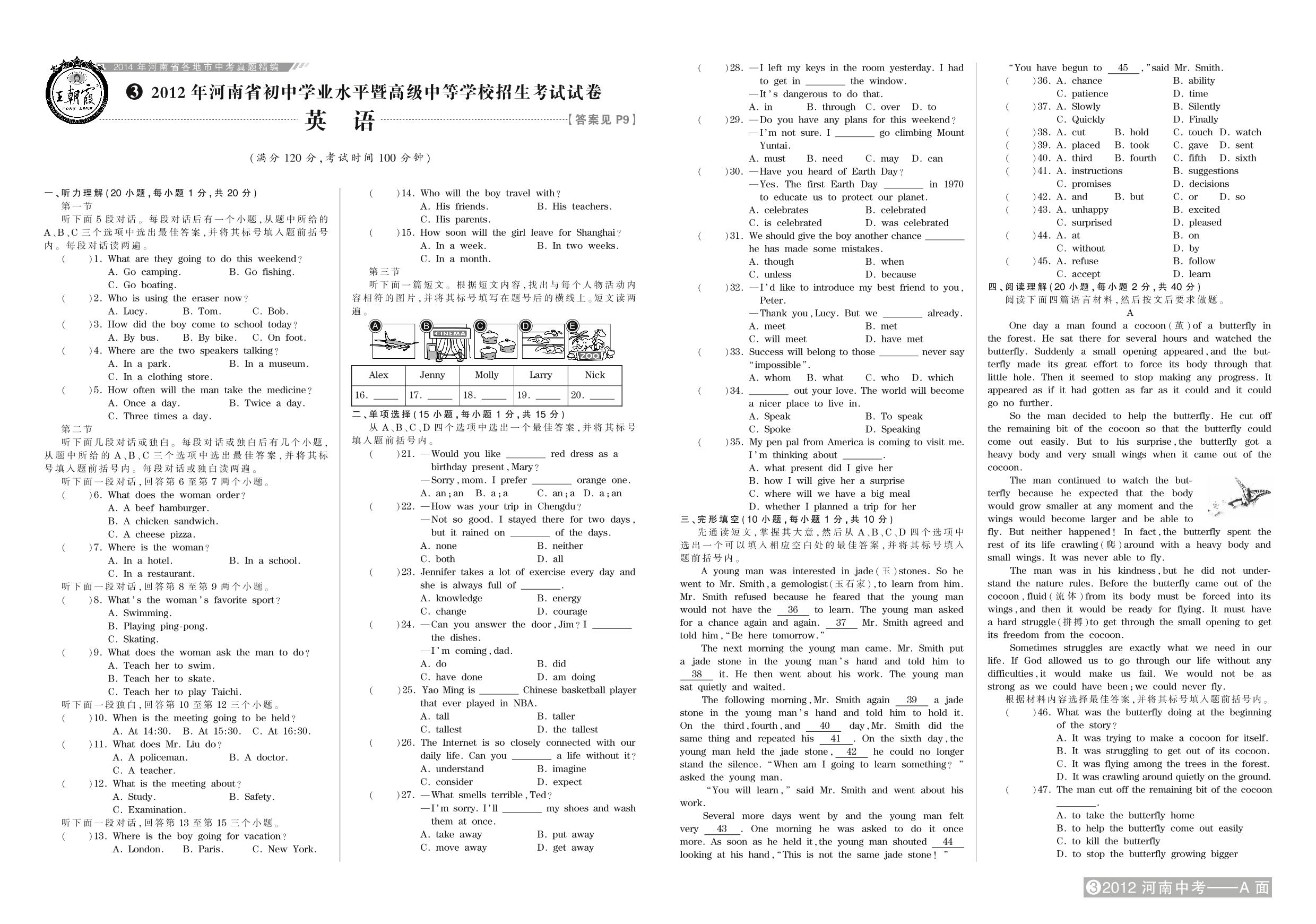 2012年河南省初中学业水平暨高级中等学校招生考试试卷【3】
