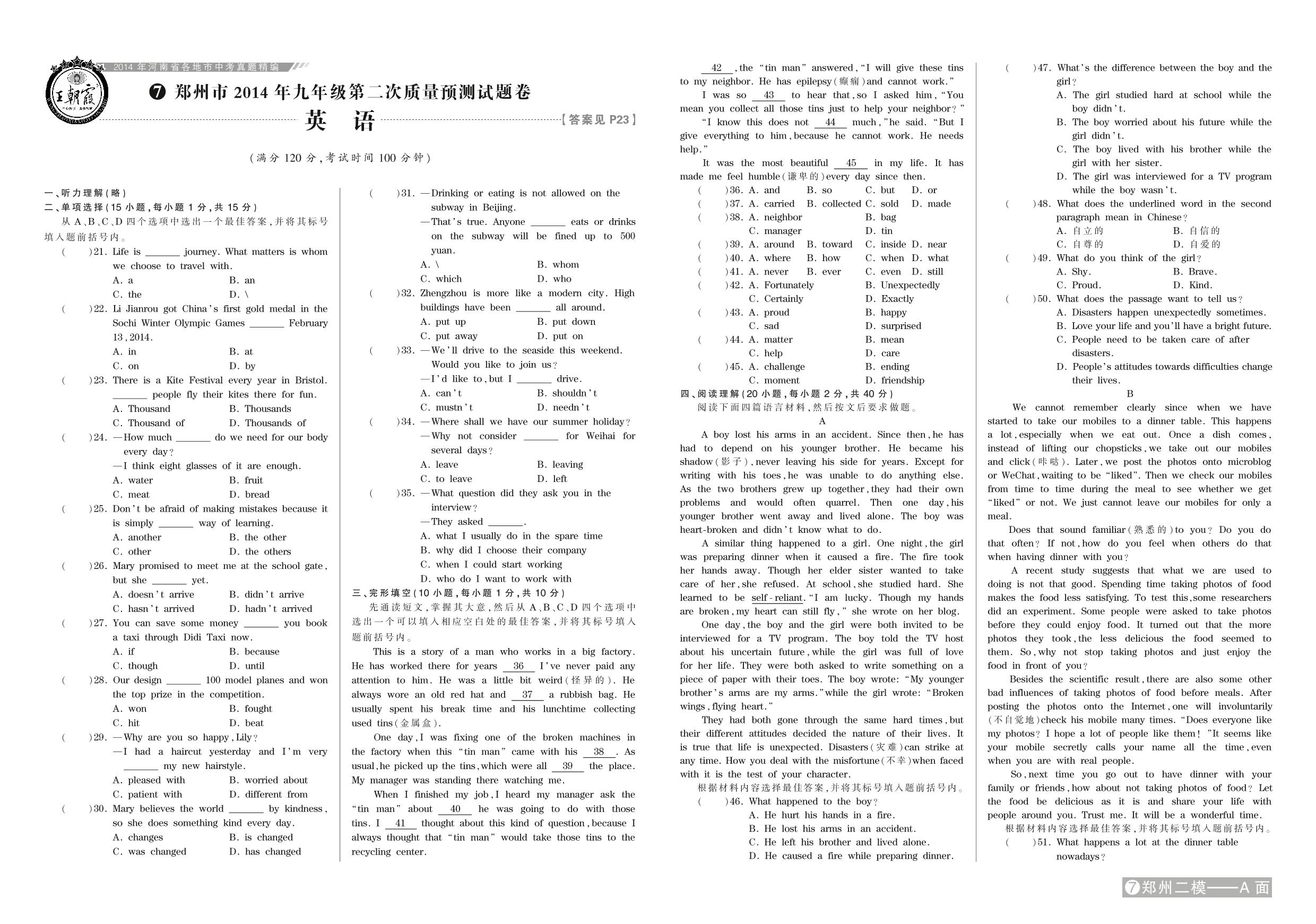 郑州市2014年九年级第二次质量预测试题卷【7】
