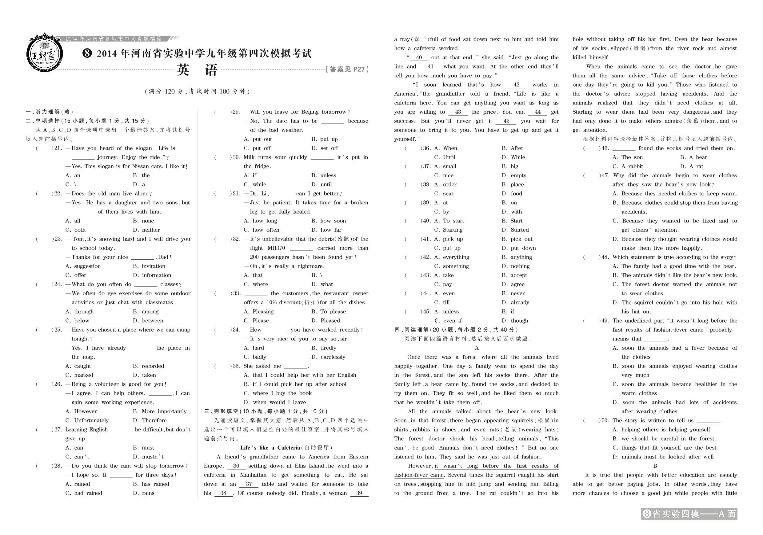 2014年河南省实验中学九年级第四次模拟考试【8】