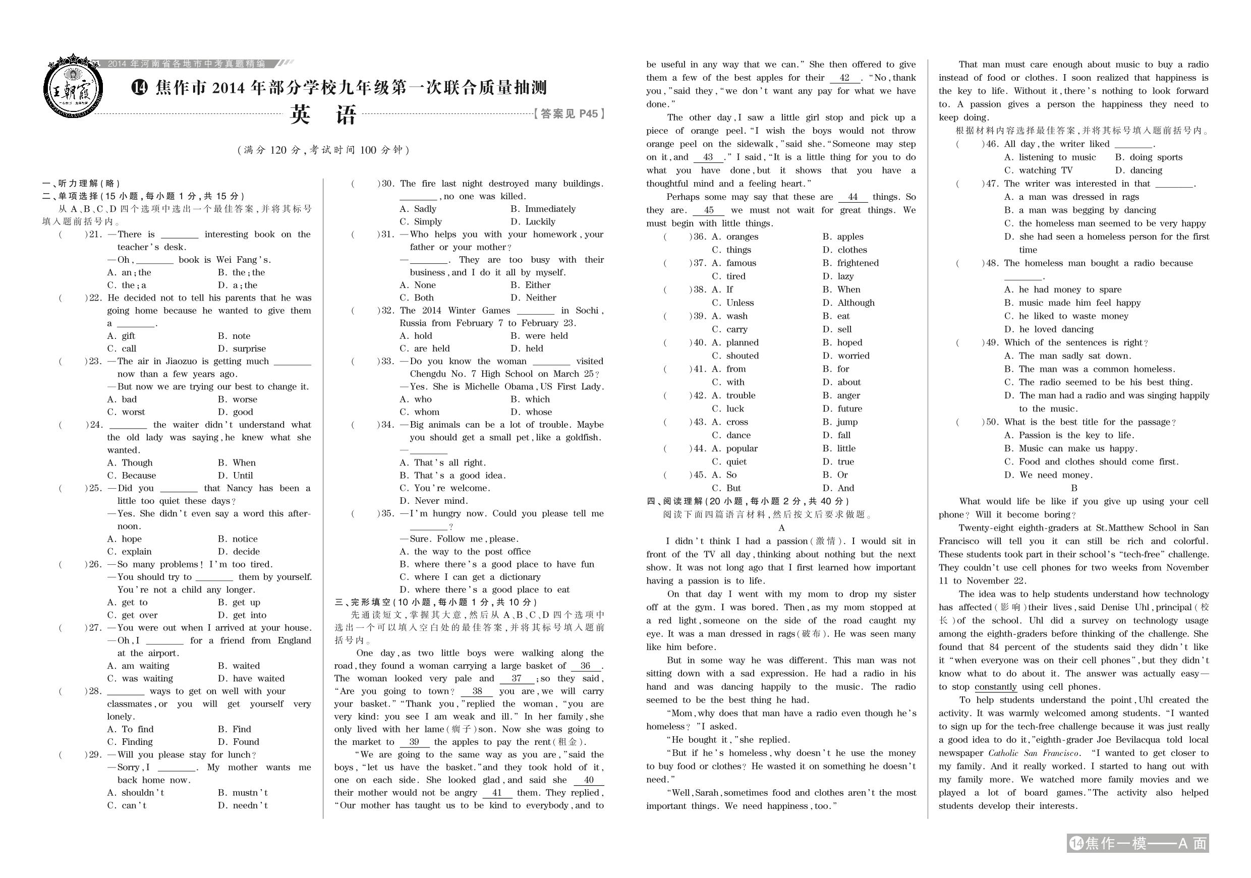 焦作市2014年部分学校九年级第一次联合质量抽测【14】