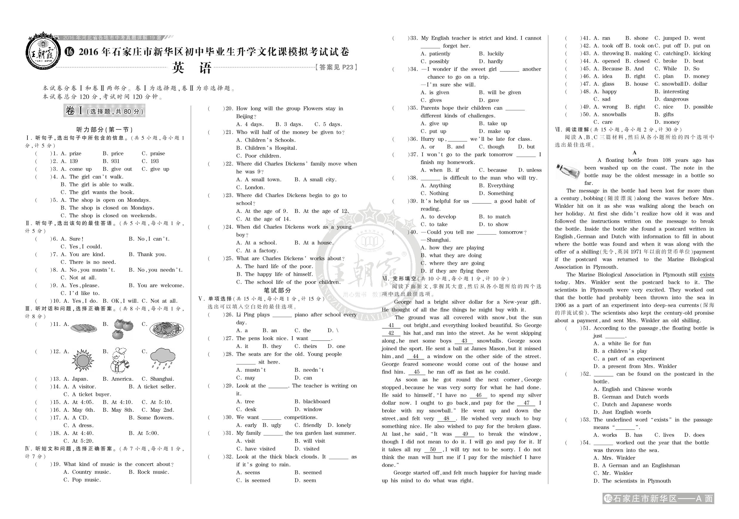 石家庄市新华区初中毕业生升学文化课模拟考试试卷【16】
