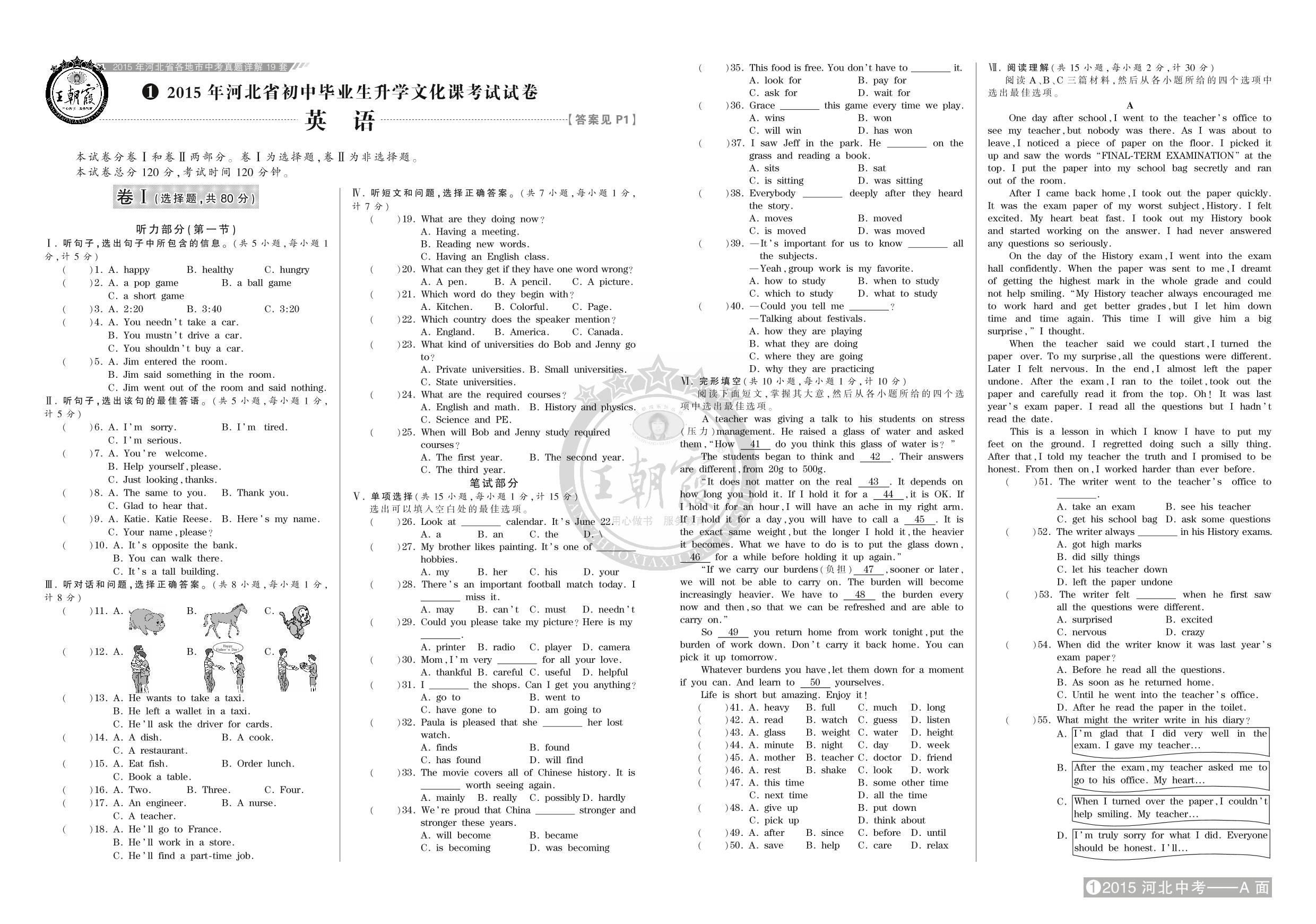 2015年河北省初中毕业生升学文化课考试试卷【1】