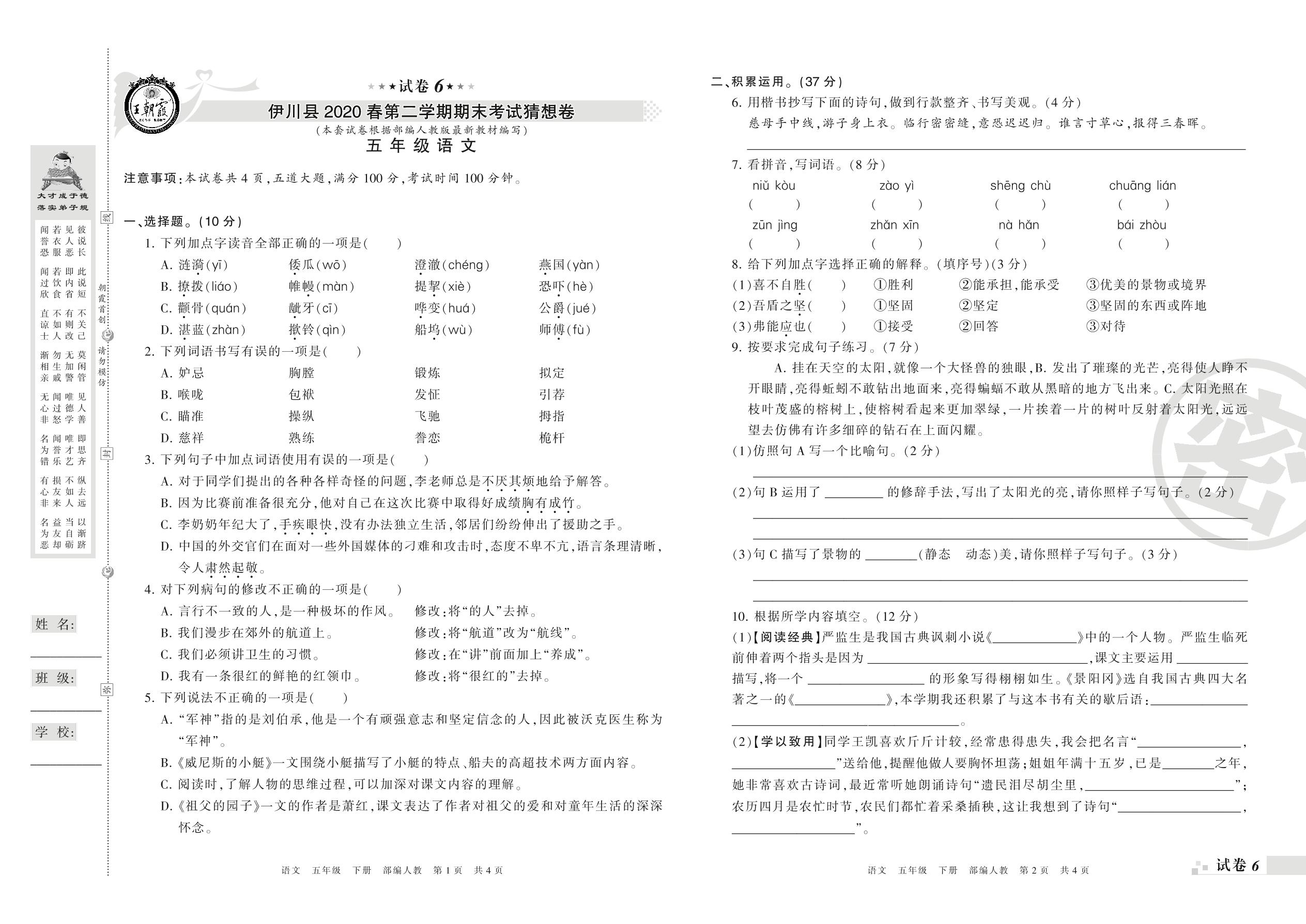2018-2019学年第二学期洛阳市伊川县猜想卷五年级语文试卷(人教版)【6】