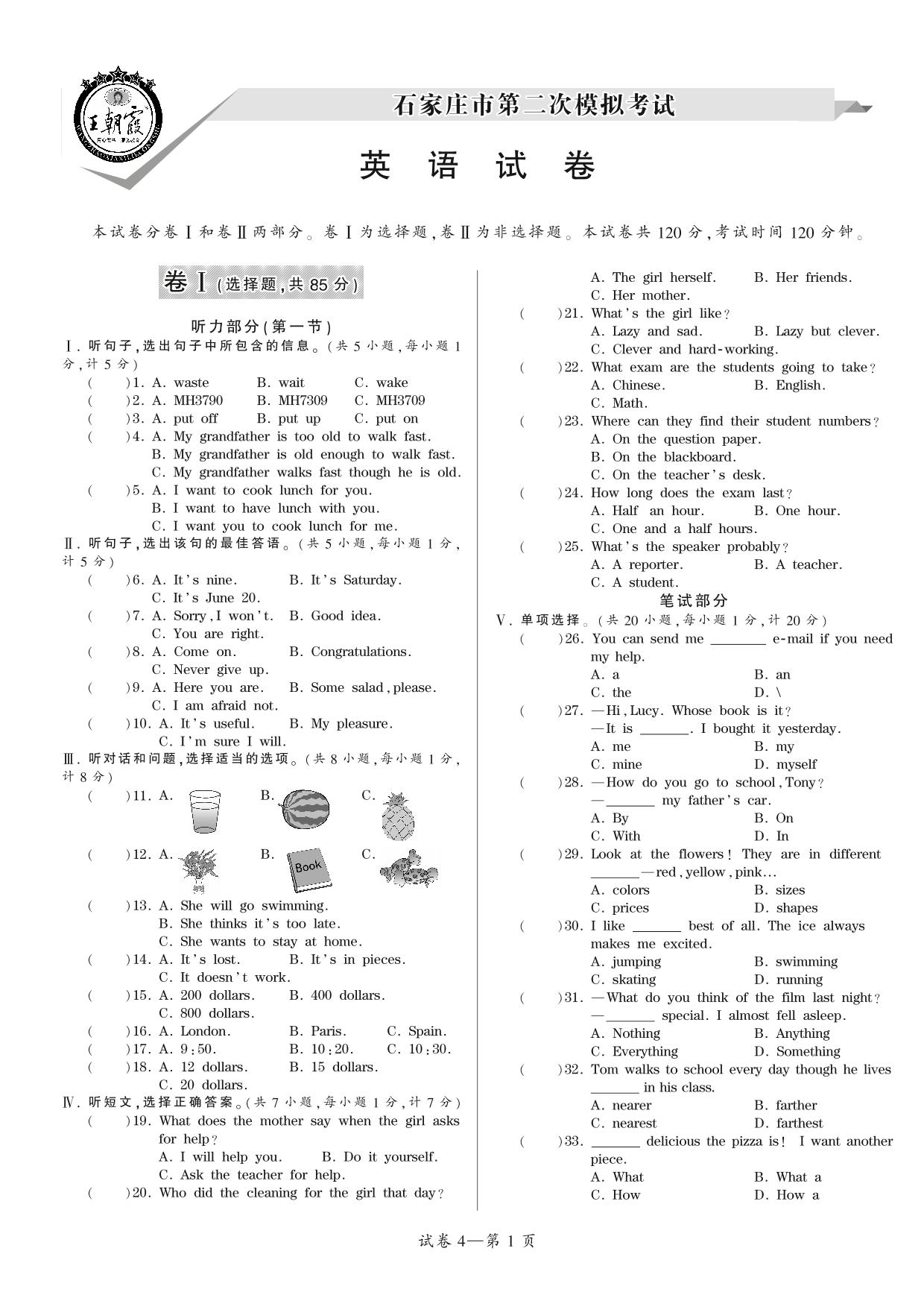 石家庄市第二次模拟考试【4】