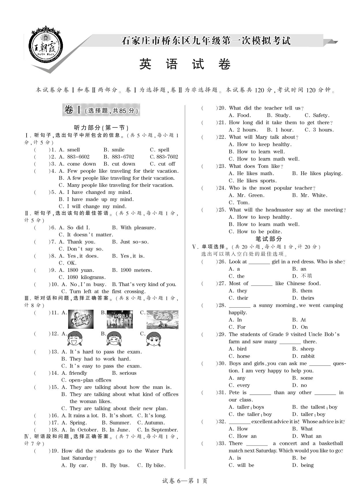 石家庄市桥东区九年级第一次模拟考试【6】