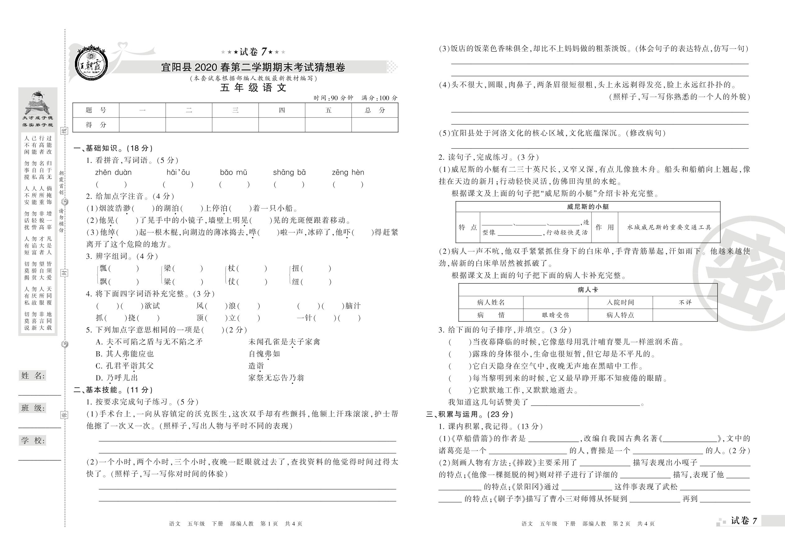2018-2019学年第二学期洛阳市宜阳县猜想卷五年级语文试卷(人教版)【7】