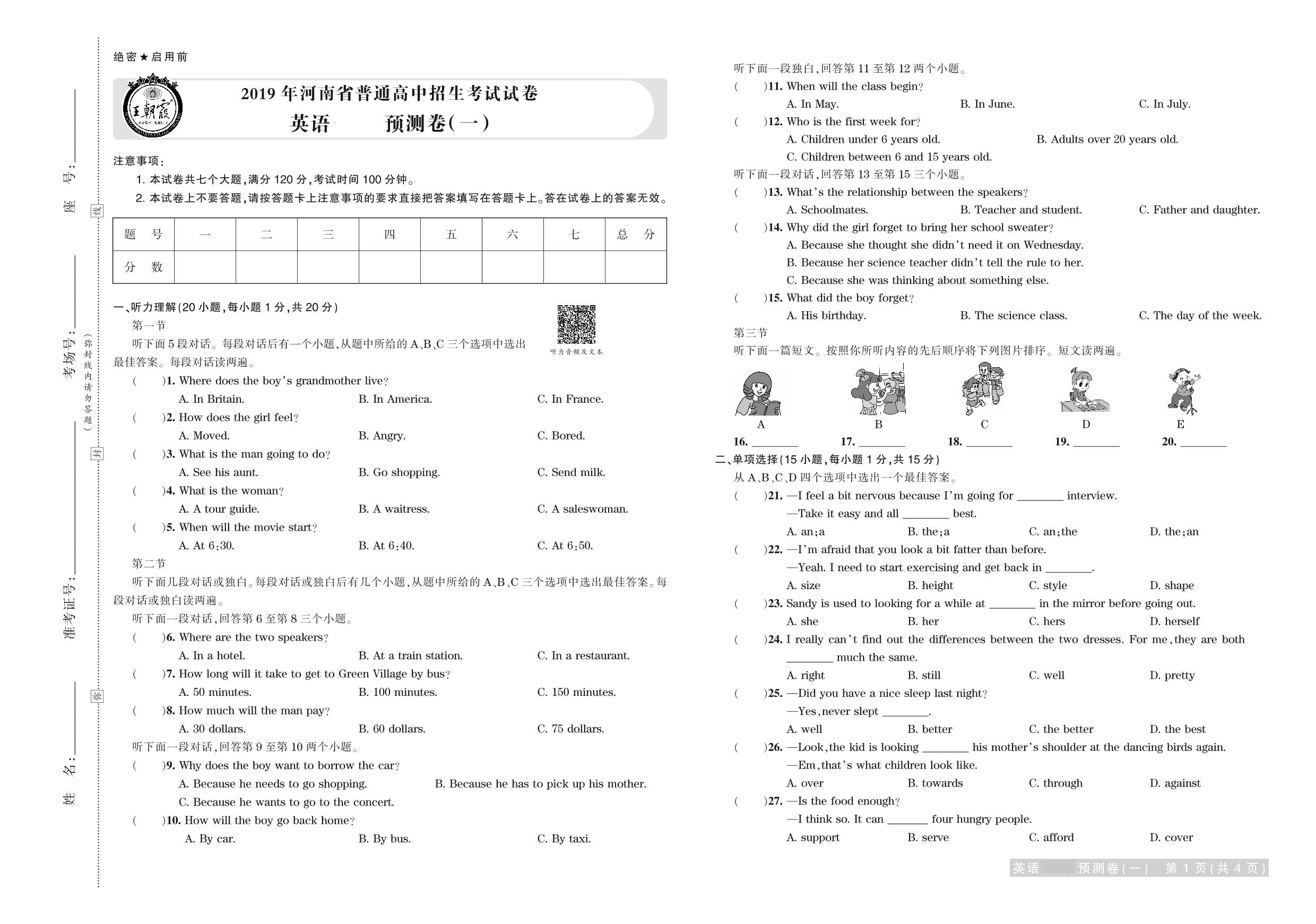 2019年河南省普通高中招生考试试卷英语·预测卷(一)