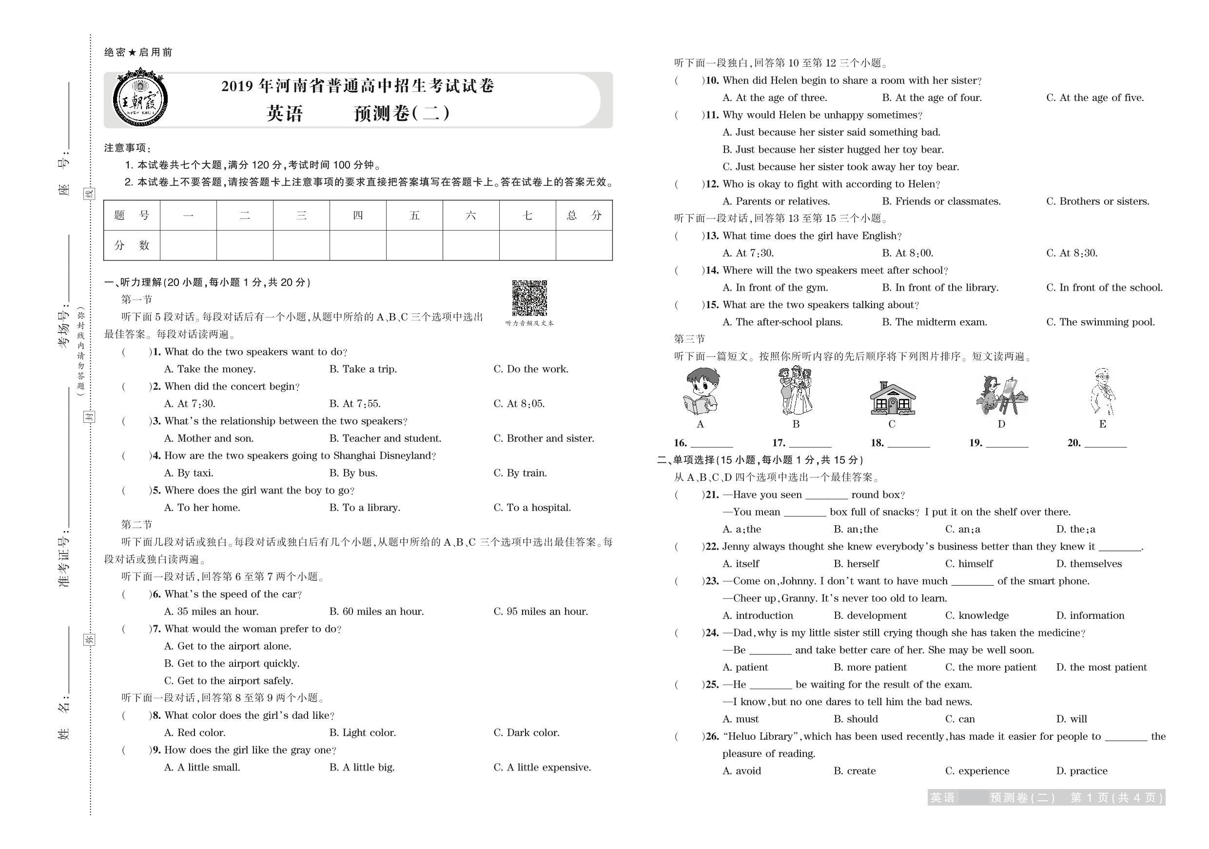 2019年河南省普通高中招生考试试卷英语·预测卷(二)