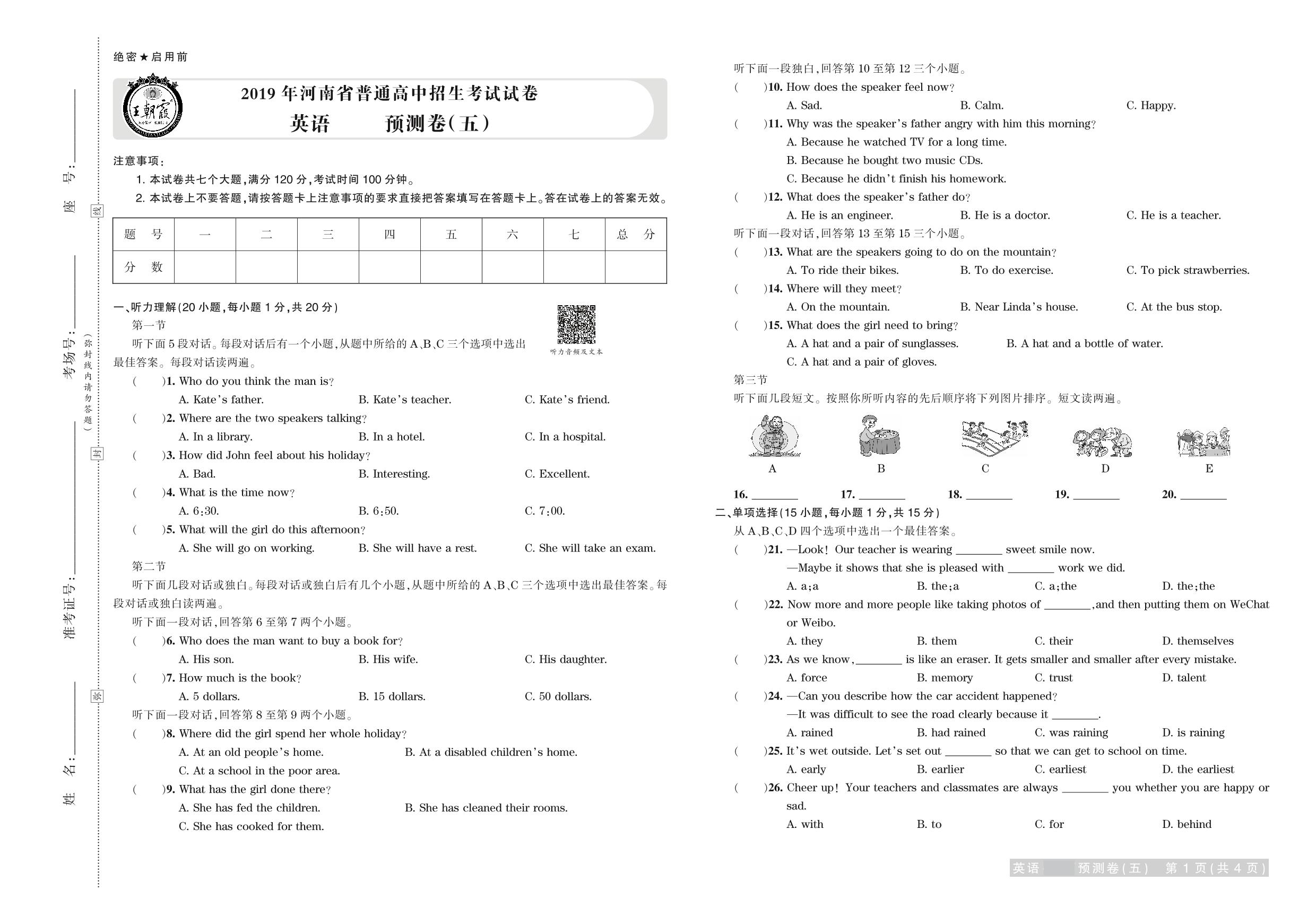 2019年河南省普通高中招生考试试卷英语·预测卷(五)