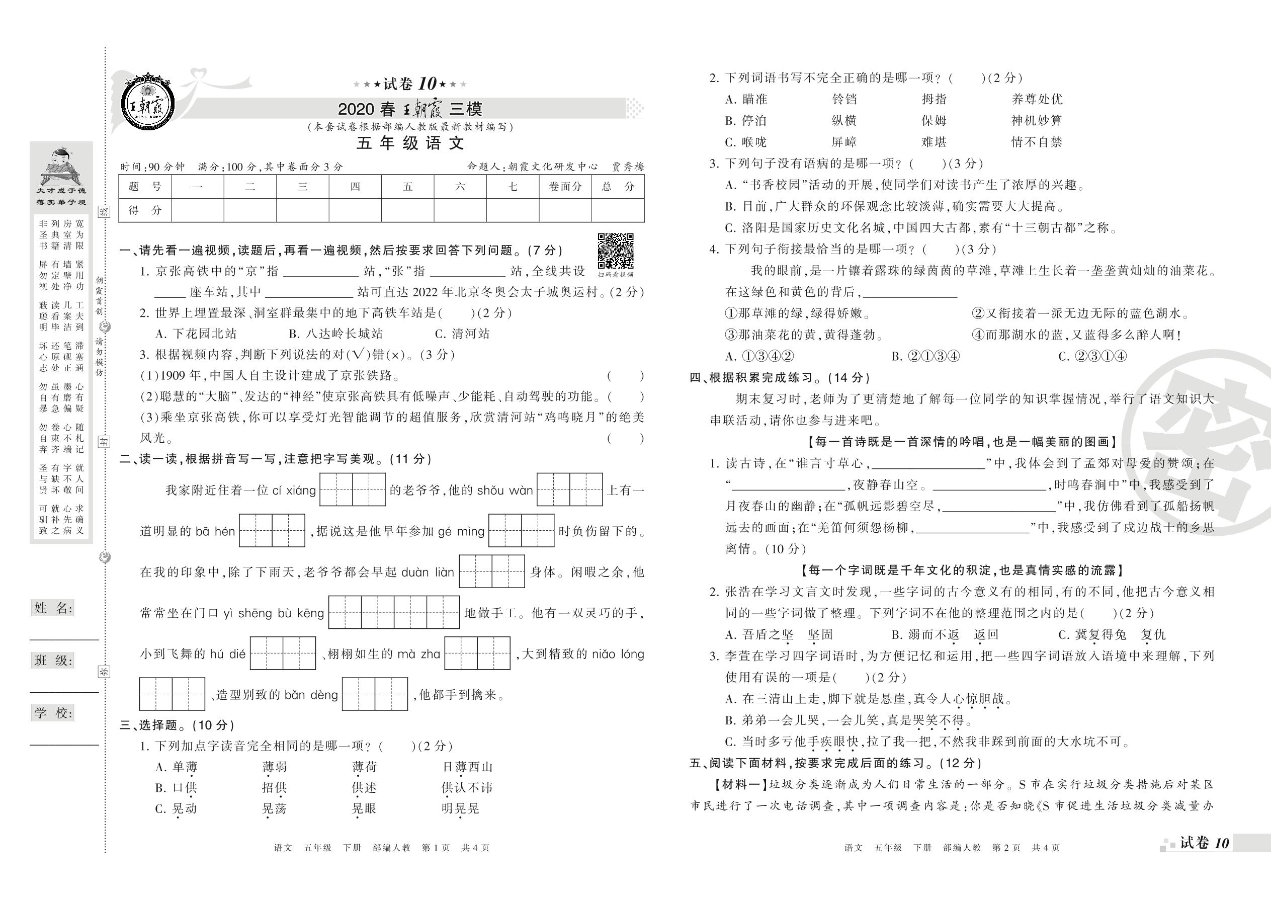 王朝霞期末模拟卷五年级下册语文(人教版)_R210801193316【10】