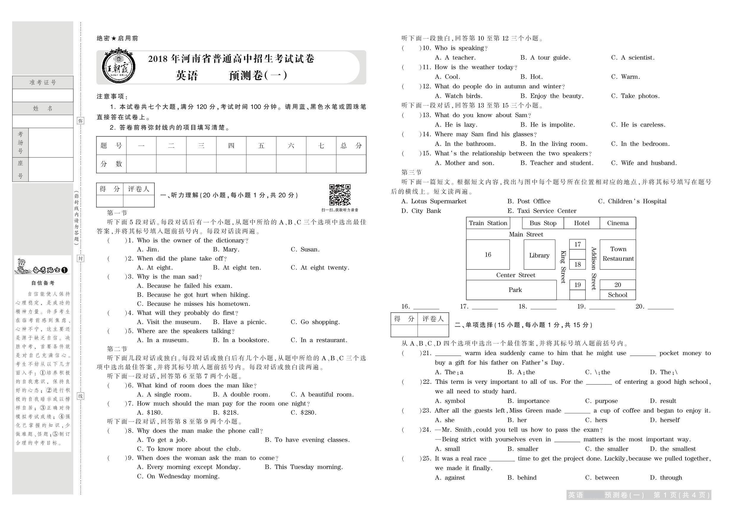 2018年河南省普通高中招生考试试卷英语·预测卷(一)