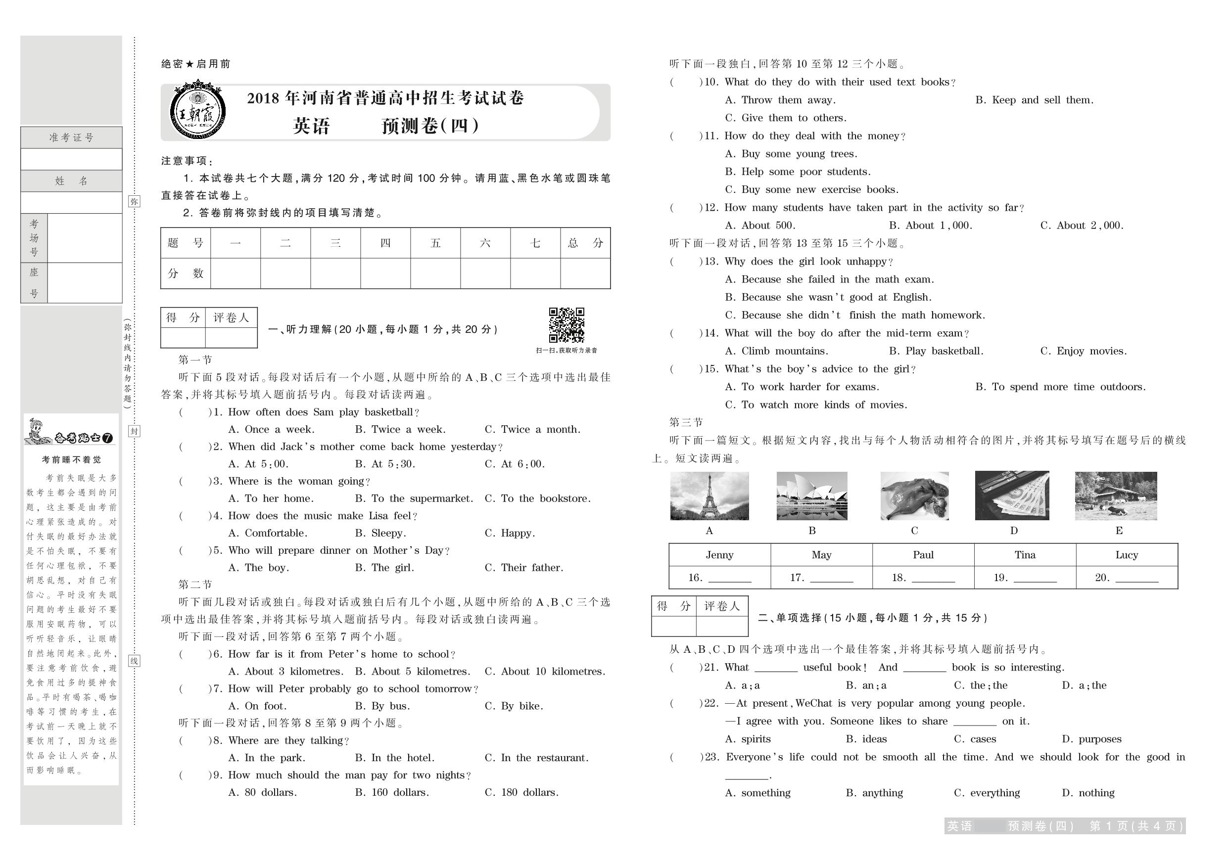 2018年河南省普通高中招生考试试卷英语·预测卷(四)