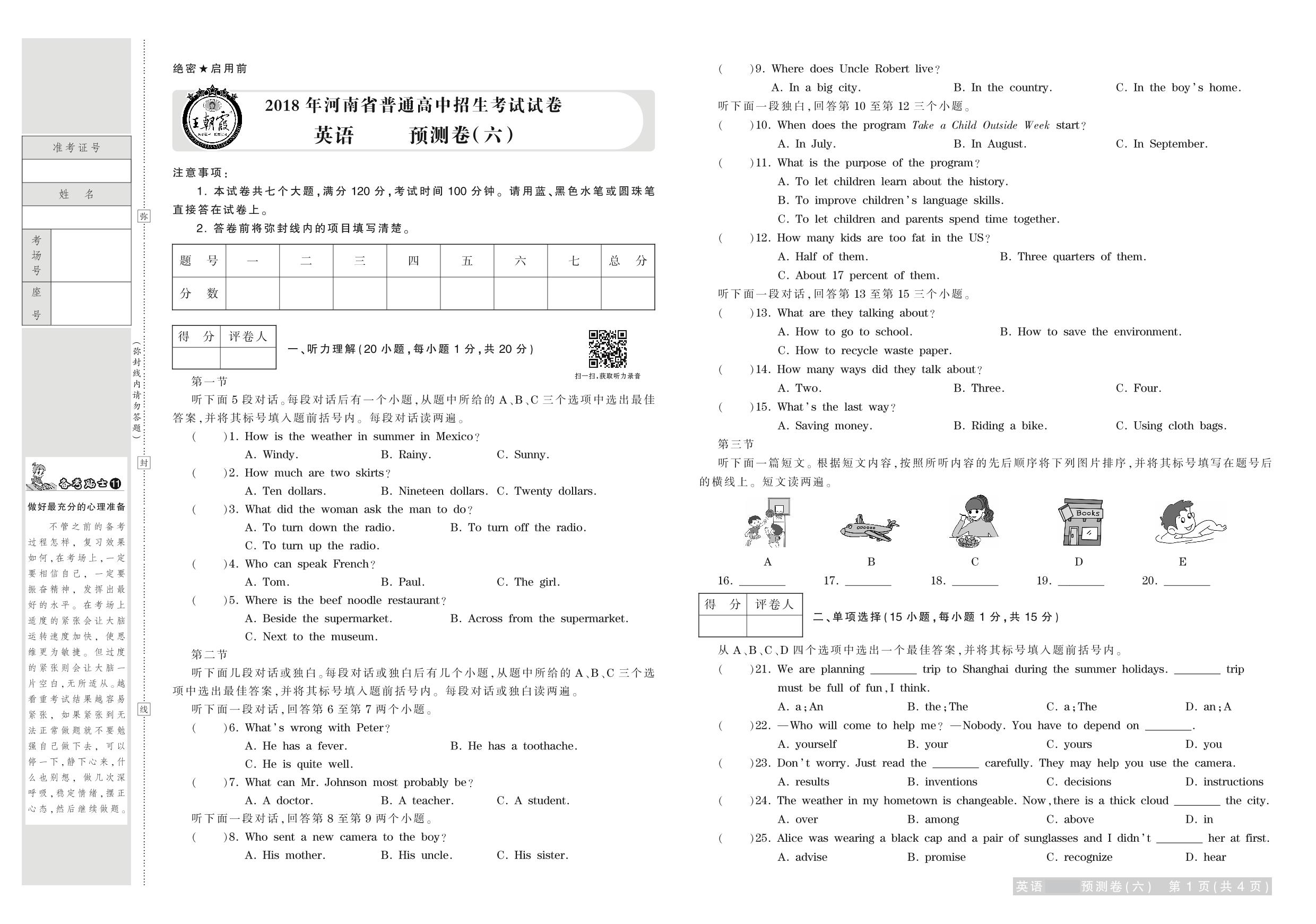 2018年河南省普通高中招生考试试卷英语·预测卷(六)