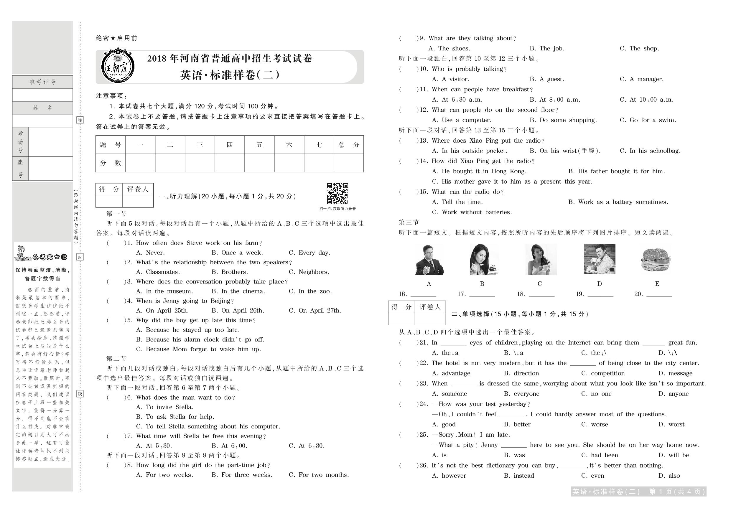 2018年河南省普通高中招生考试试卷英语·标准样卷(二)