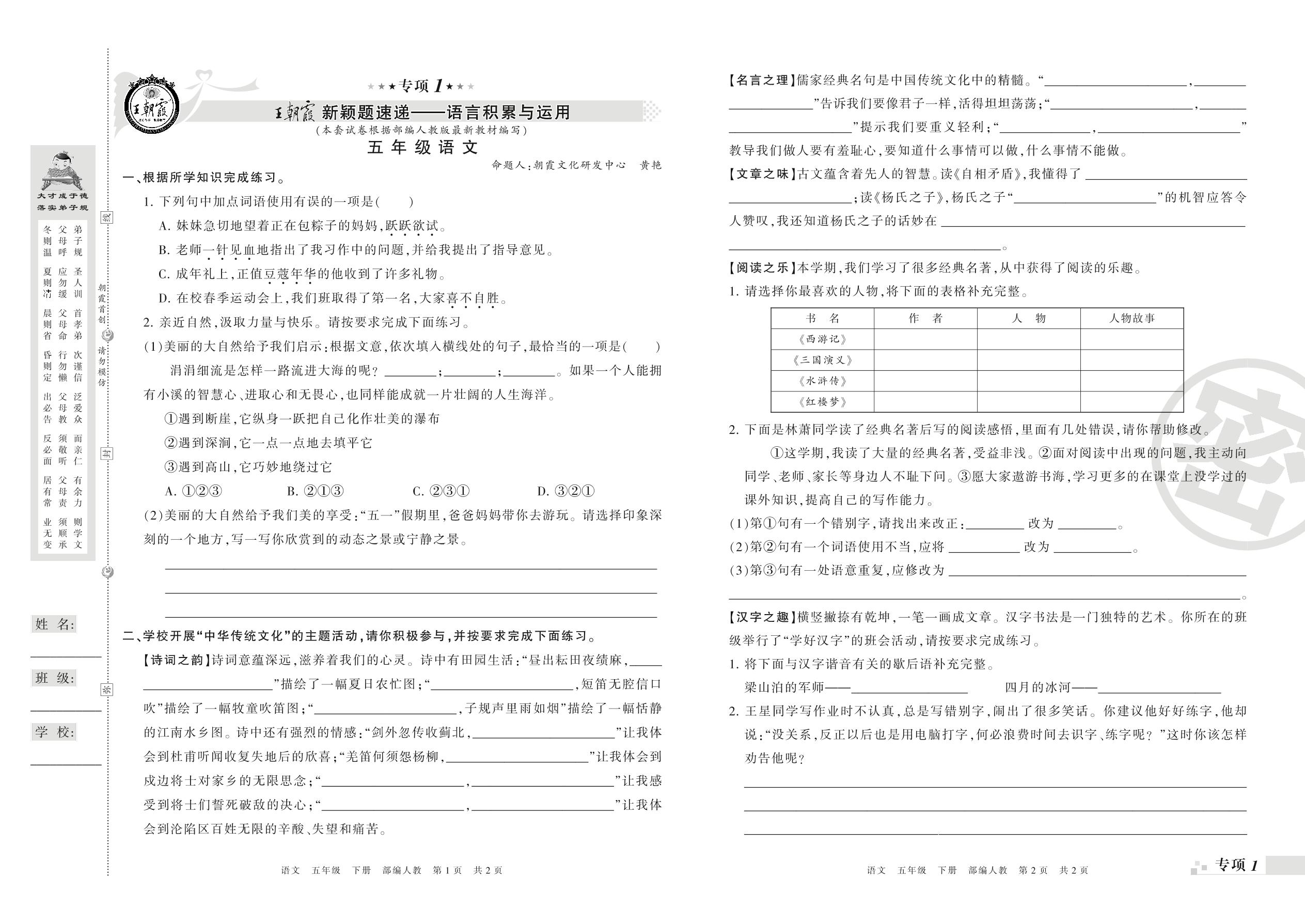 王朝霞期末专项卷——新颖题速递:语言积累与运用、非连续性文本阅读五年级下册语文(人教版)_R210801193335【0】