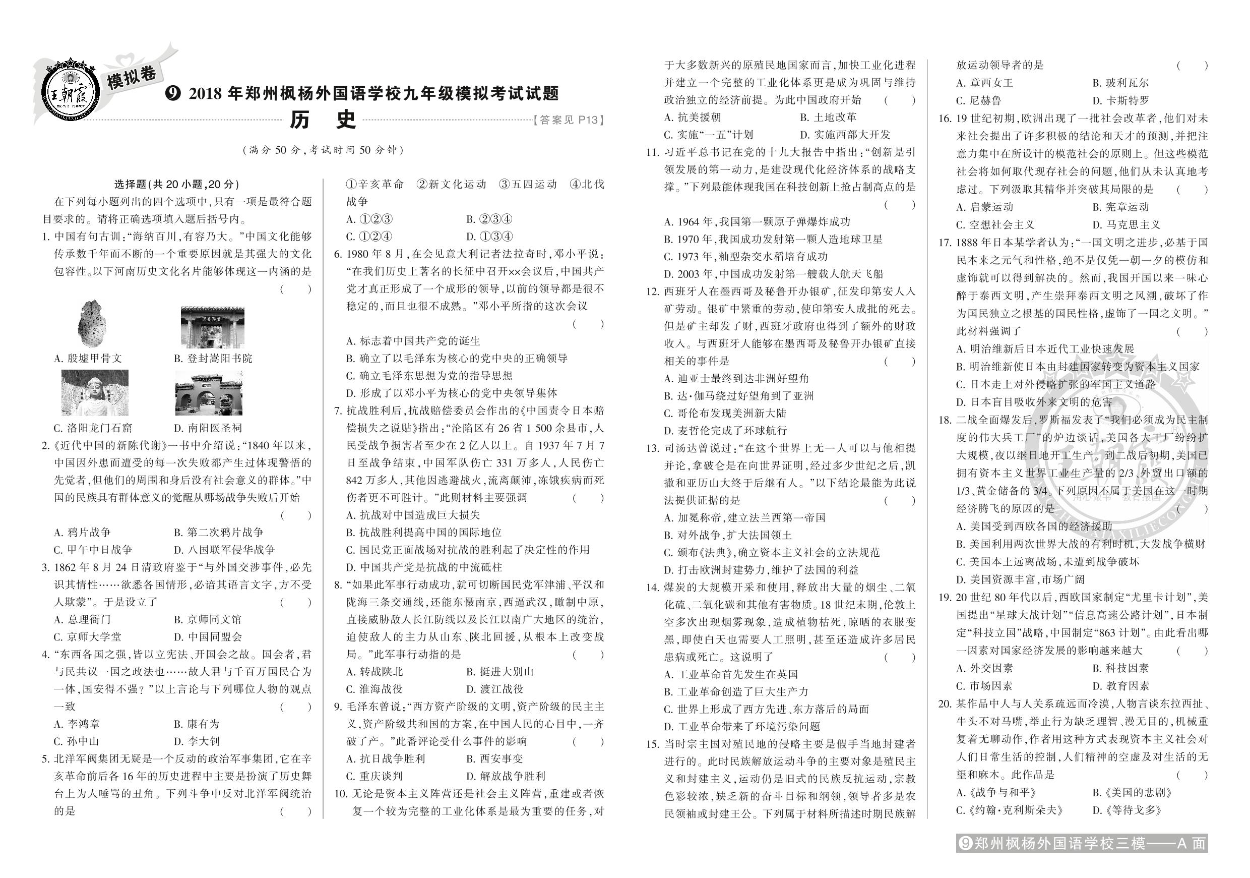 2018年郑州枫杨外国语学校九年级模拟考试试题【9】