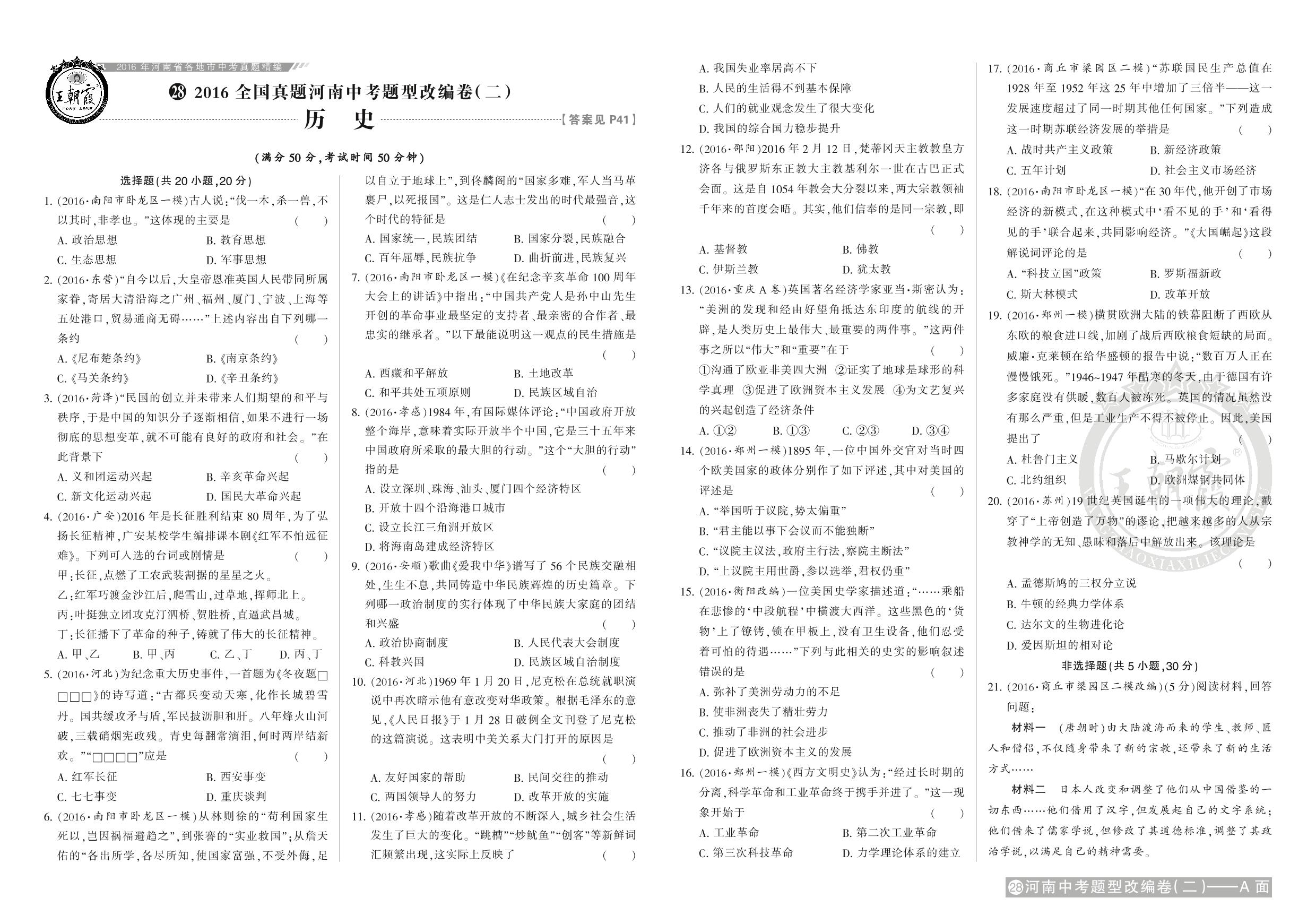 九年级历史全国通用中考卷