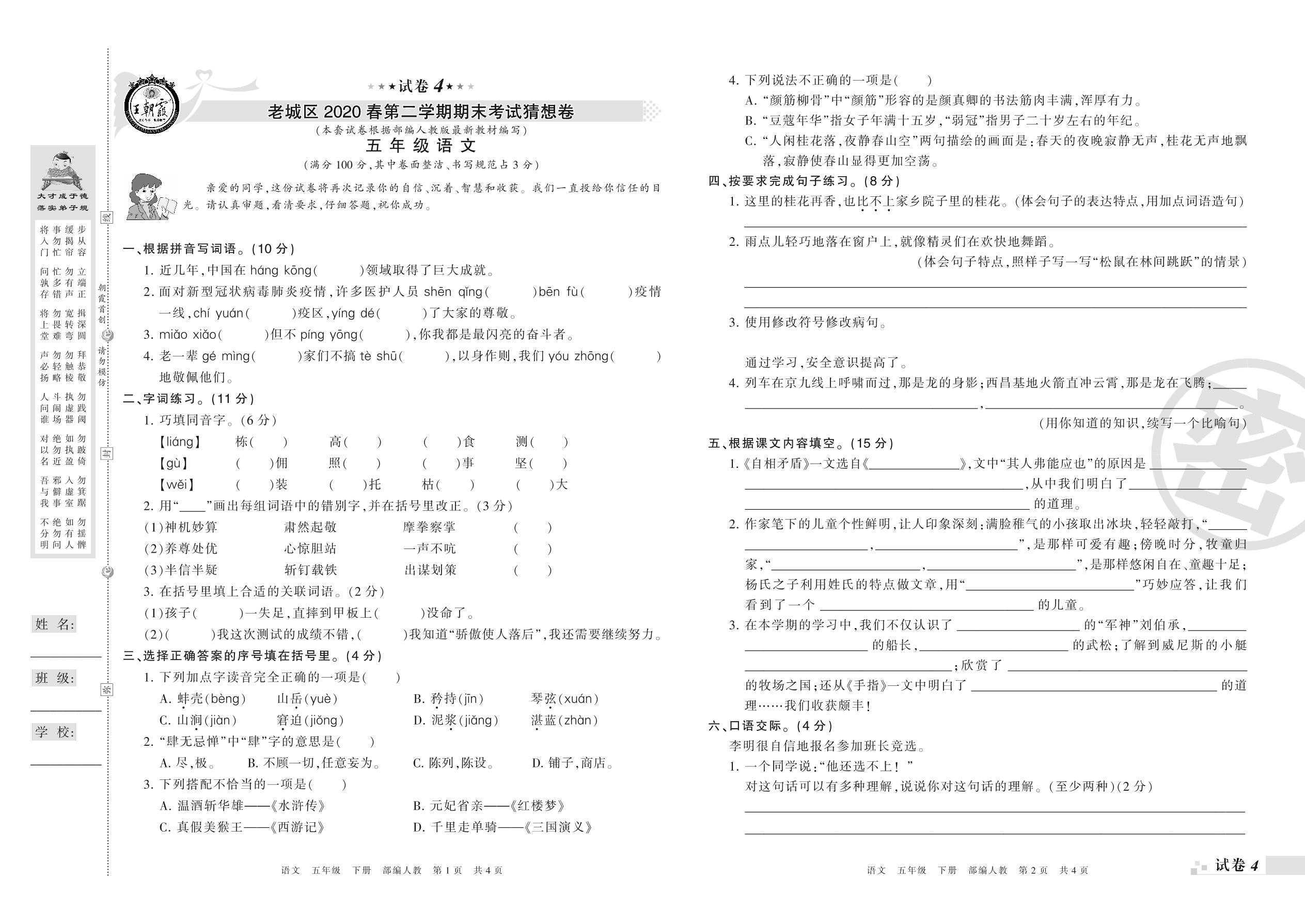 2018-2019学年第二学期洛阳市老城区猜想卷五年级语文试卷(人教版)【4】