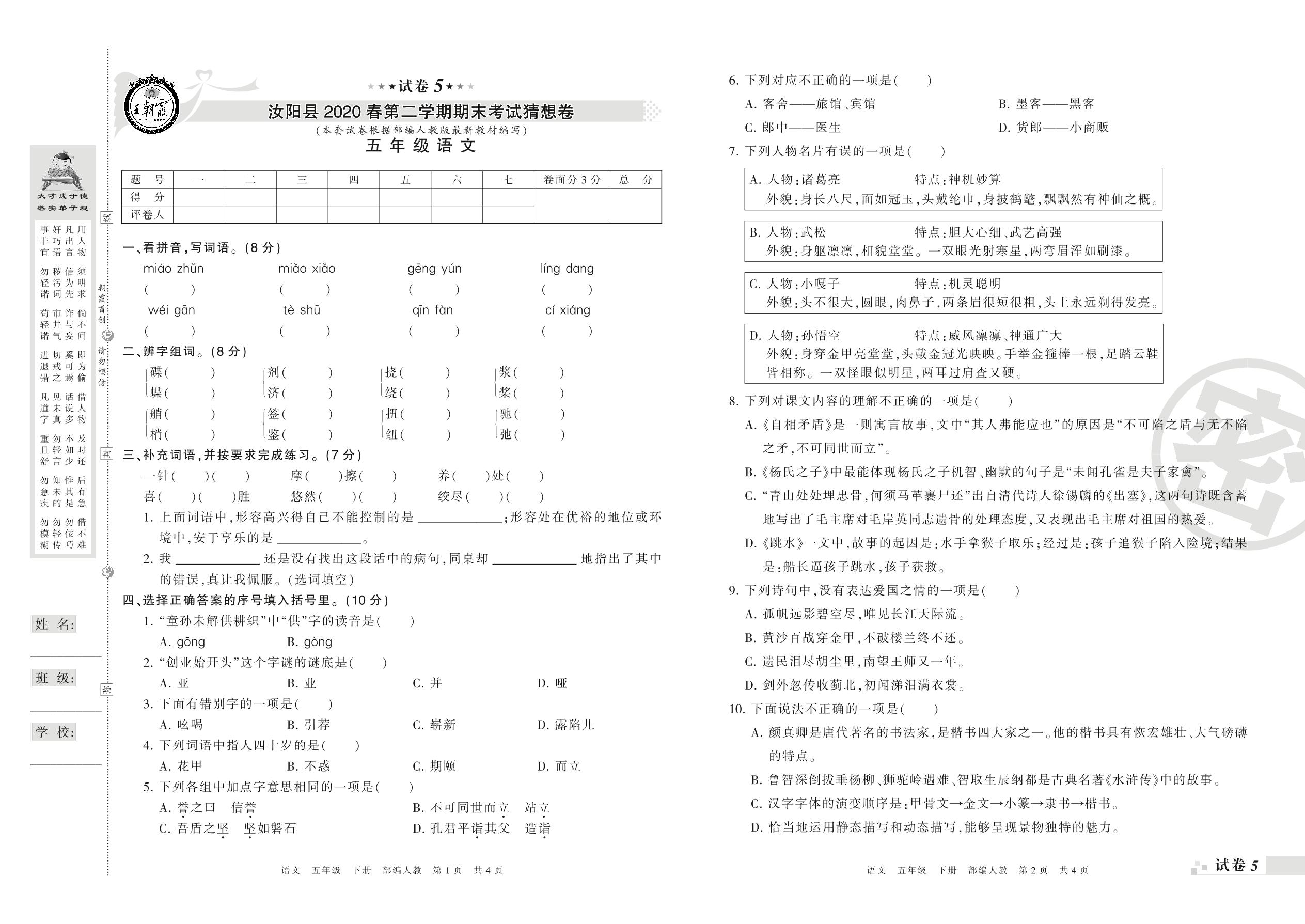 2018-2019学年第二学期洛阳市汝阳县猜想卷五年级语文试卷(人教版)【5】