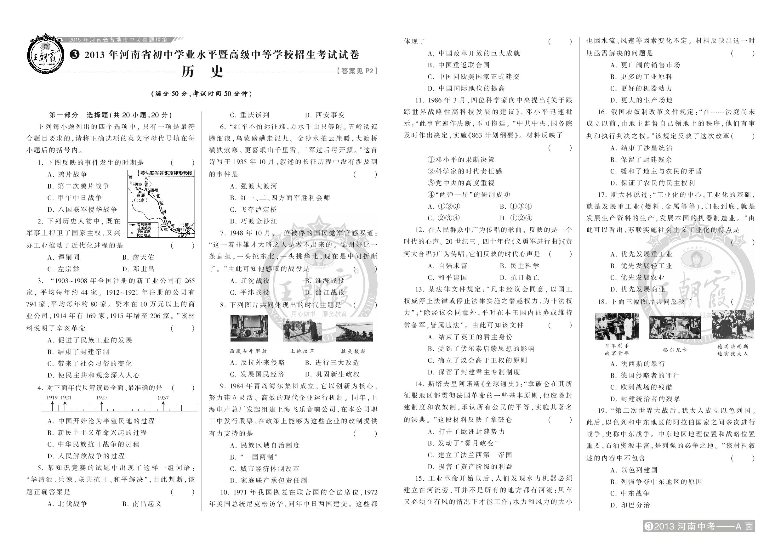 2013年河南省初中学业水平暨高级中等学校招生考试试卷【3】
