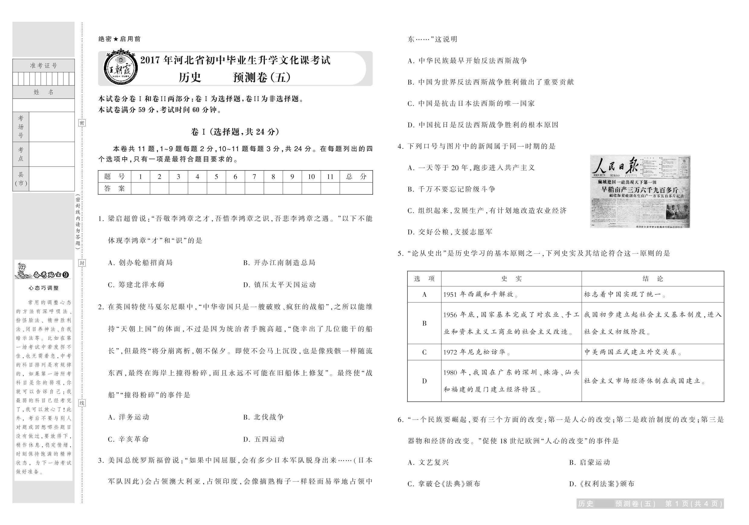 2017年河北省普通高中招生考试试卷历史·预测卷(五)