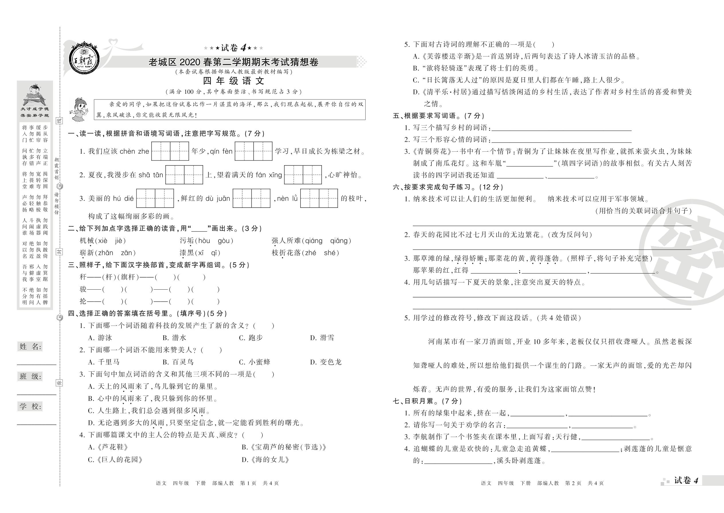 四年级语文人教版下册期末卷