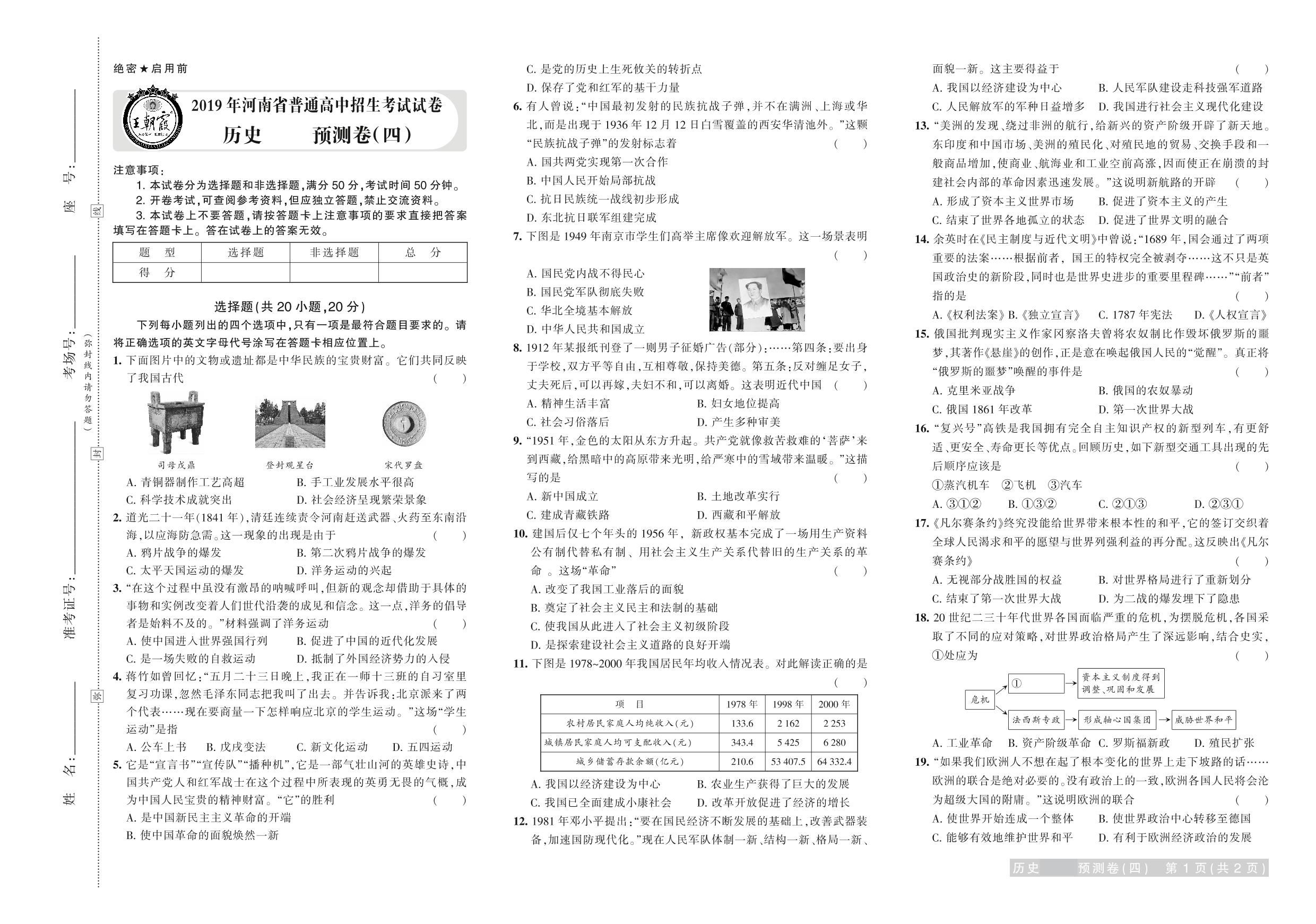 2019年河南省普通高中招生考试试卷历史·预测卷(四)