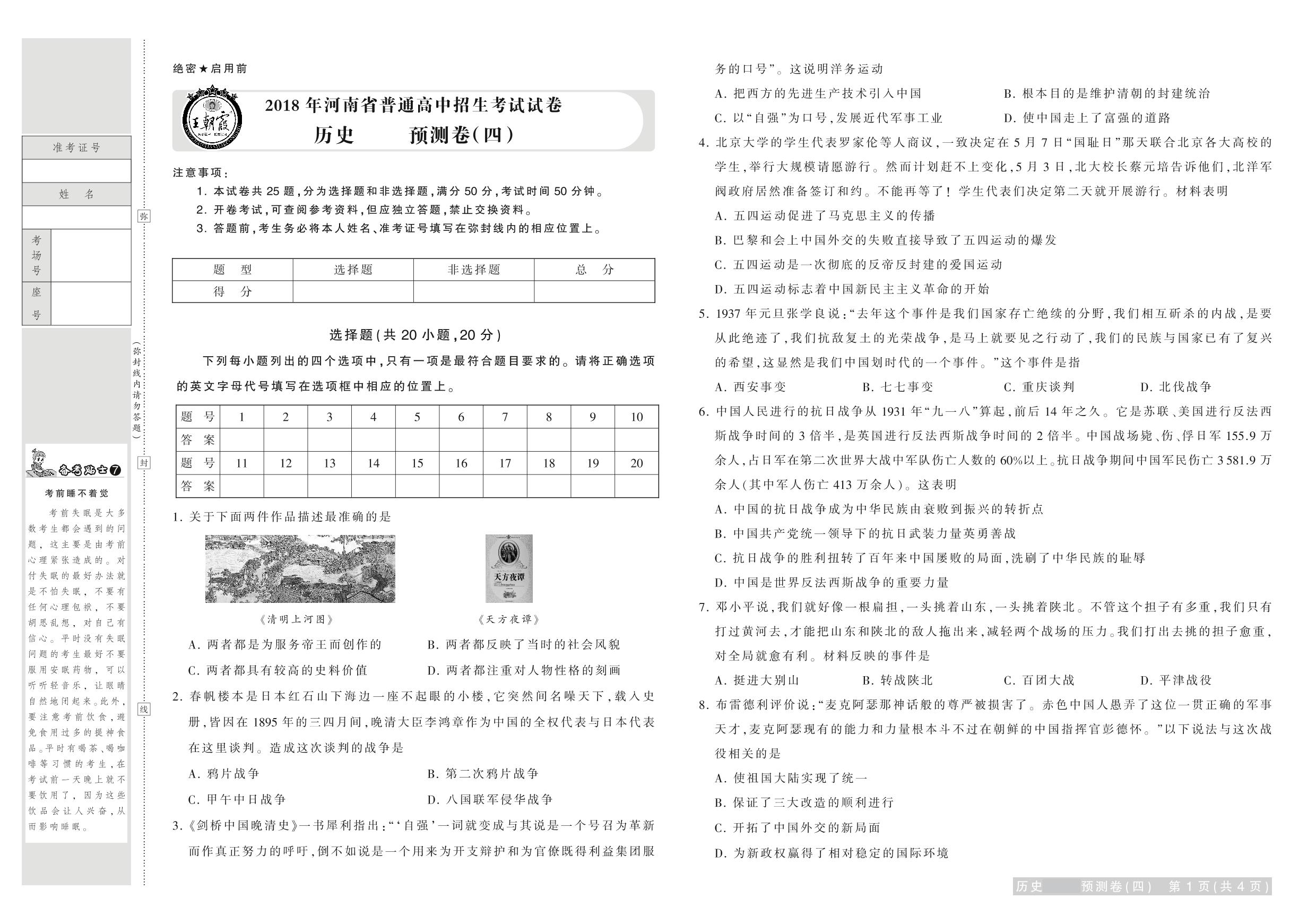 2018年河南省普通高中招生考试试卷历史·预测卷(四)