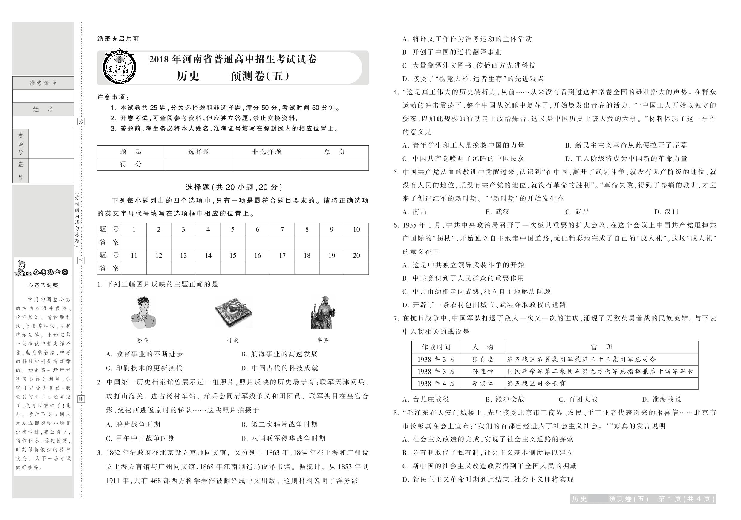 2018年河南省普通高中招生考试试卷历史·预测卷(五)
