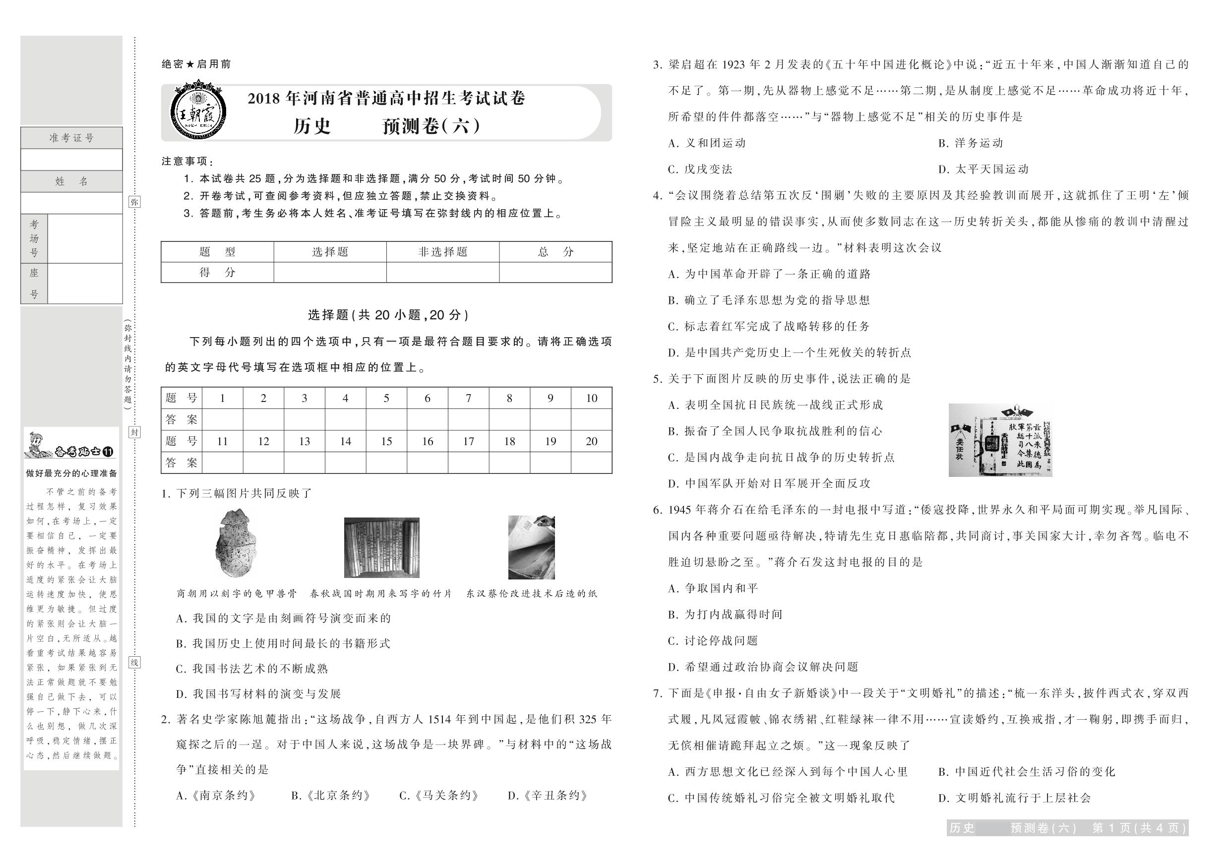2018年河南省普通高中招生考试试卷历史·预测卷(六)