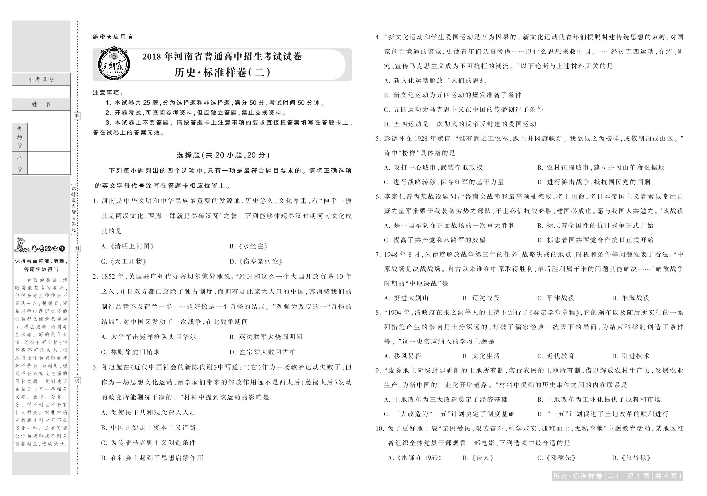 2018年河南省普通高中招生考试试卷历史·标准样卷(二)