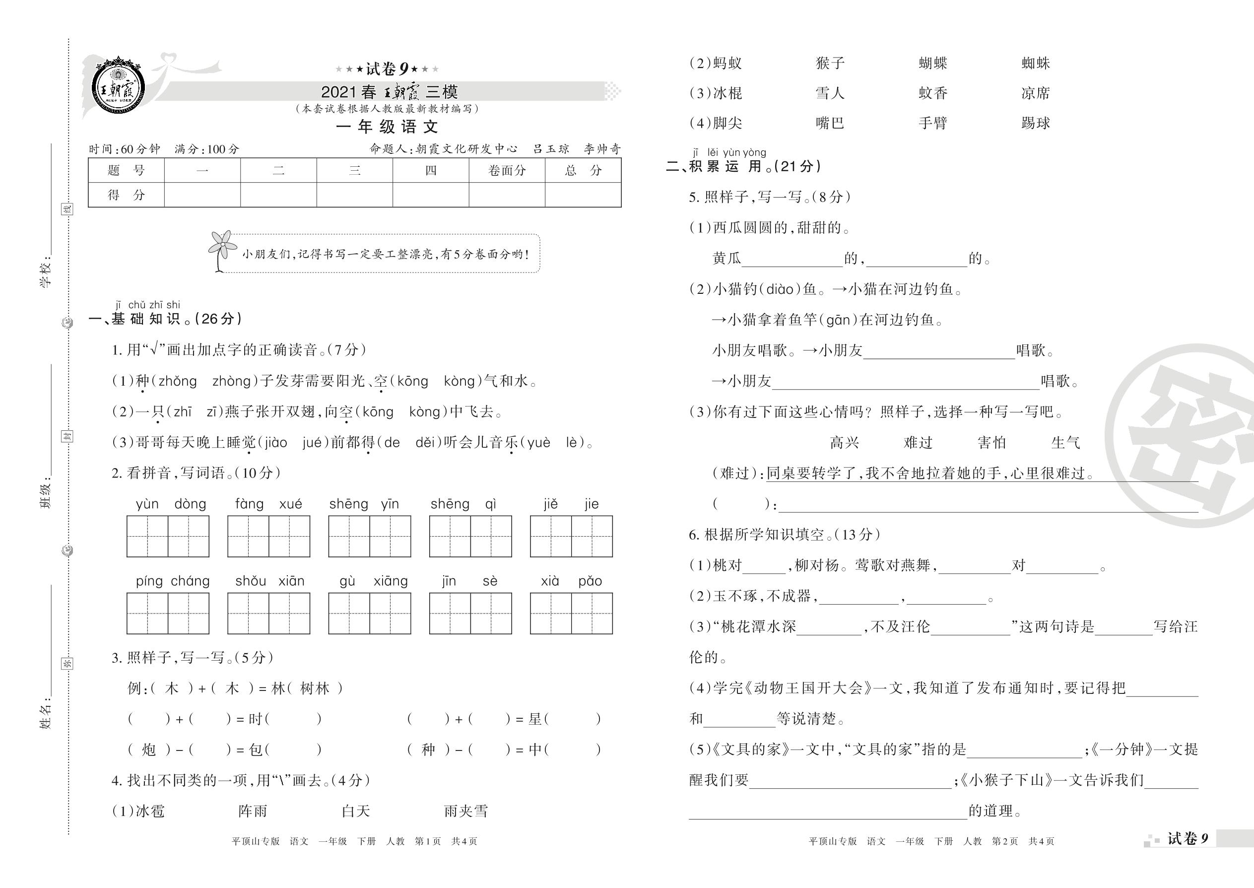 王朝霞期末模拟卷一年级下册语文(人教版)_R210731172908【9】