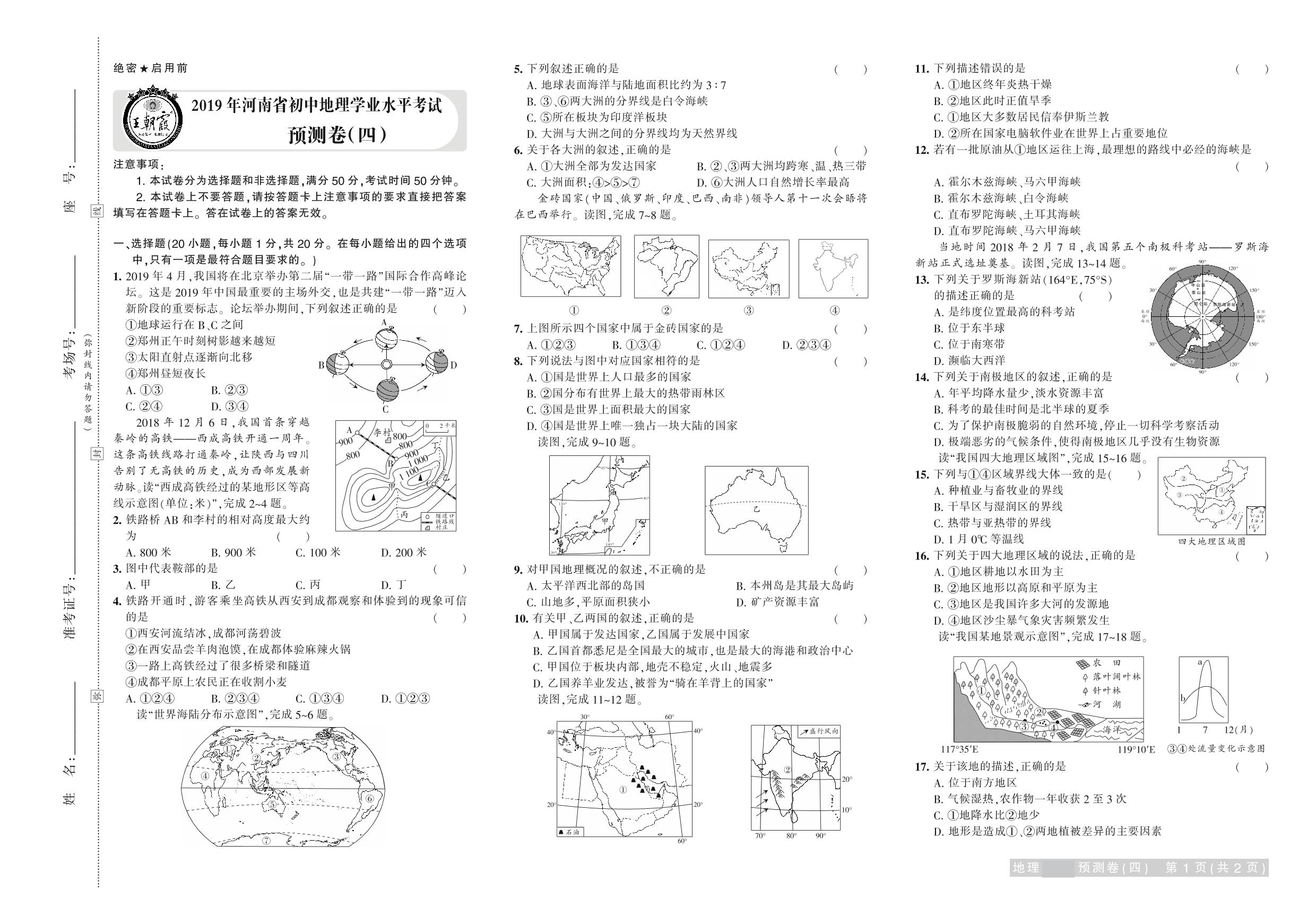 2019年河南省普通高中招生考试试卷地理·预测卷(四)