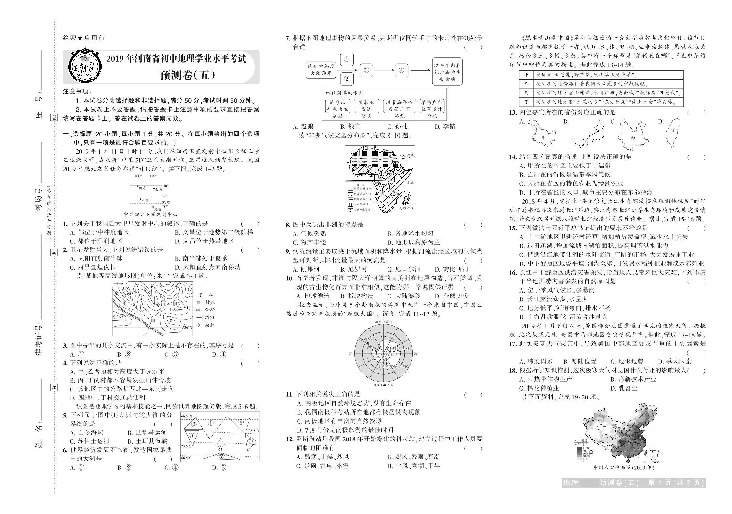 2019年河南省普通高中招生考试试卷地理·预测卷(五)