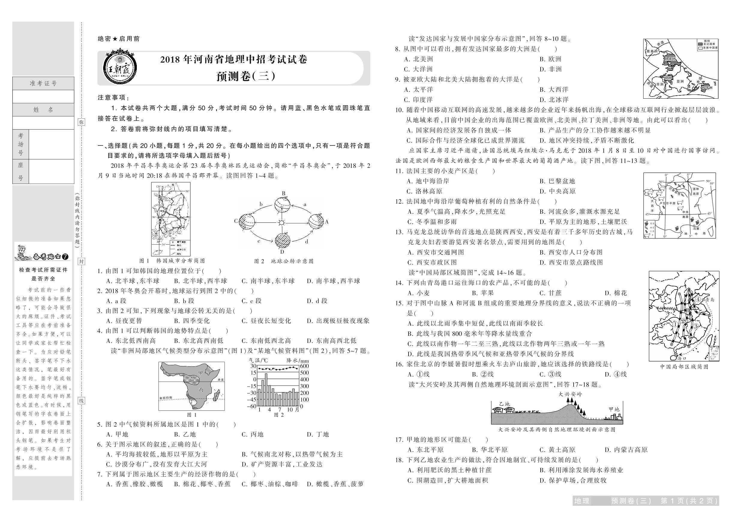 2018年河南省普通高中招生考试试卷地理·预测卷(三)