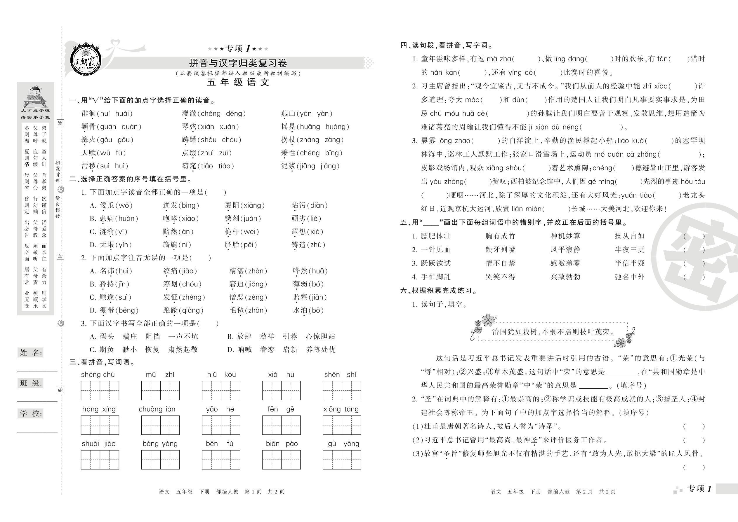 王朝霞期末专项卷——拼音与汉字、词语真题归类复习卷五年级下册语文(人教版)_R210801193630【0】