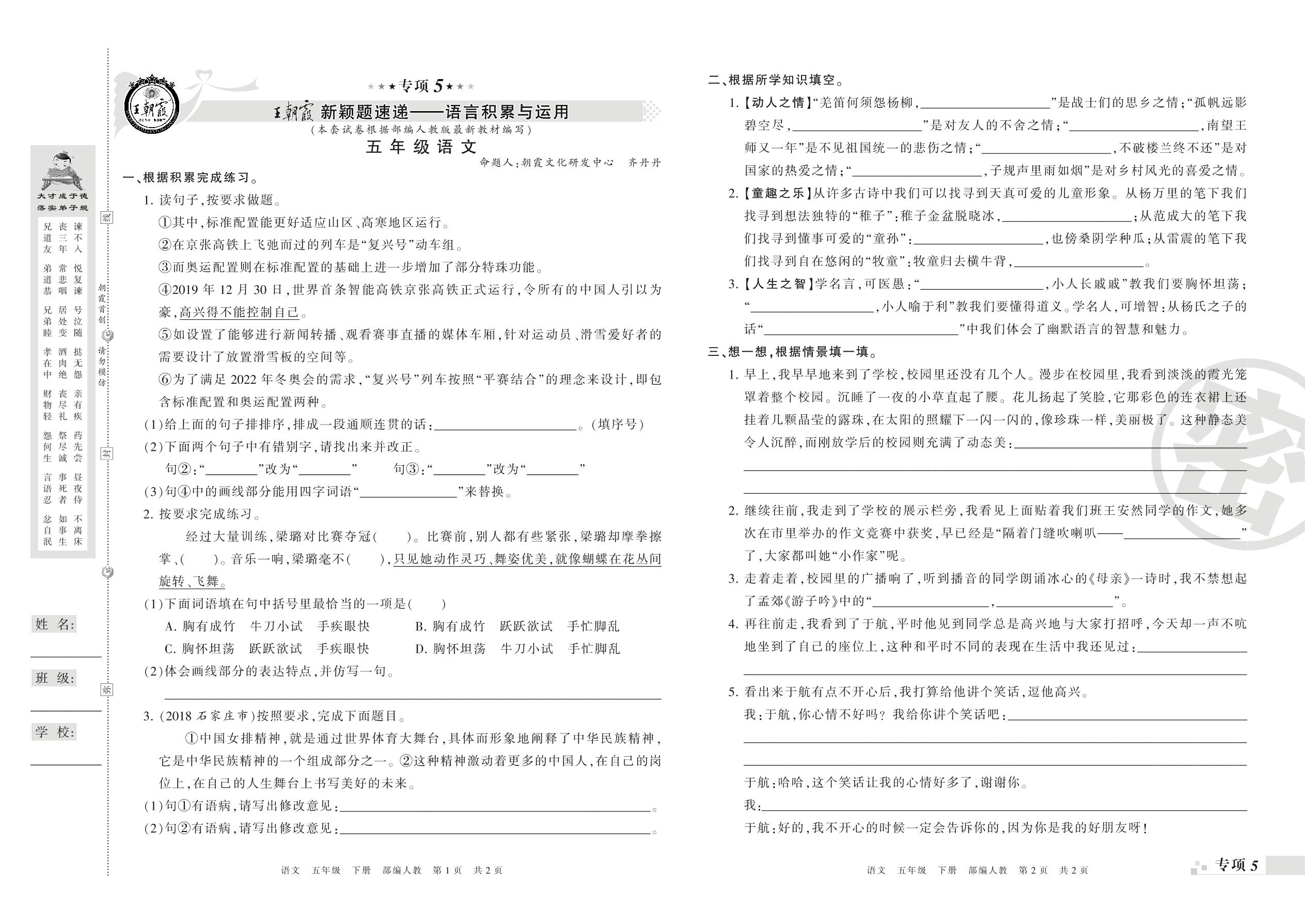 王朝霞期末专项卷——新颖题速递:语言积累与运用、非连续性文本阅读五年级下册语文(人教版)_R210801193637【0】
