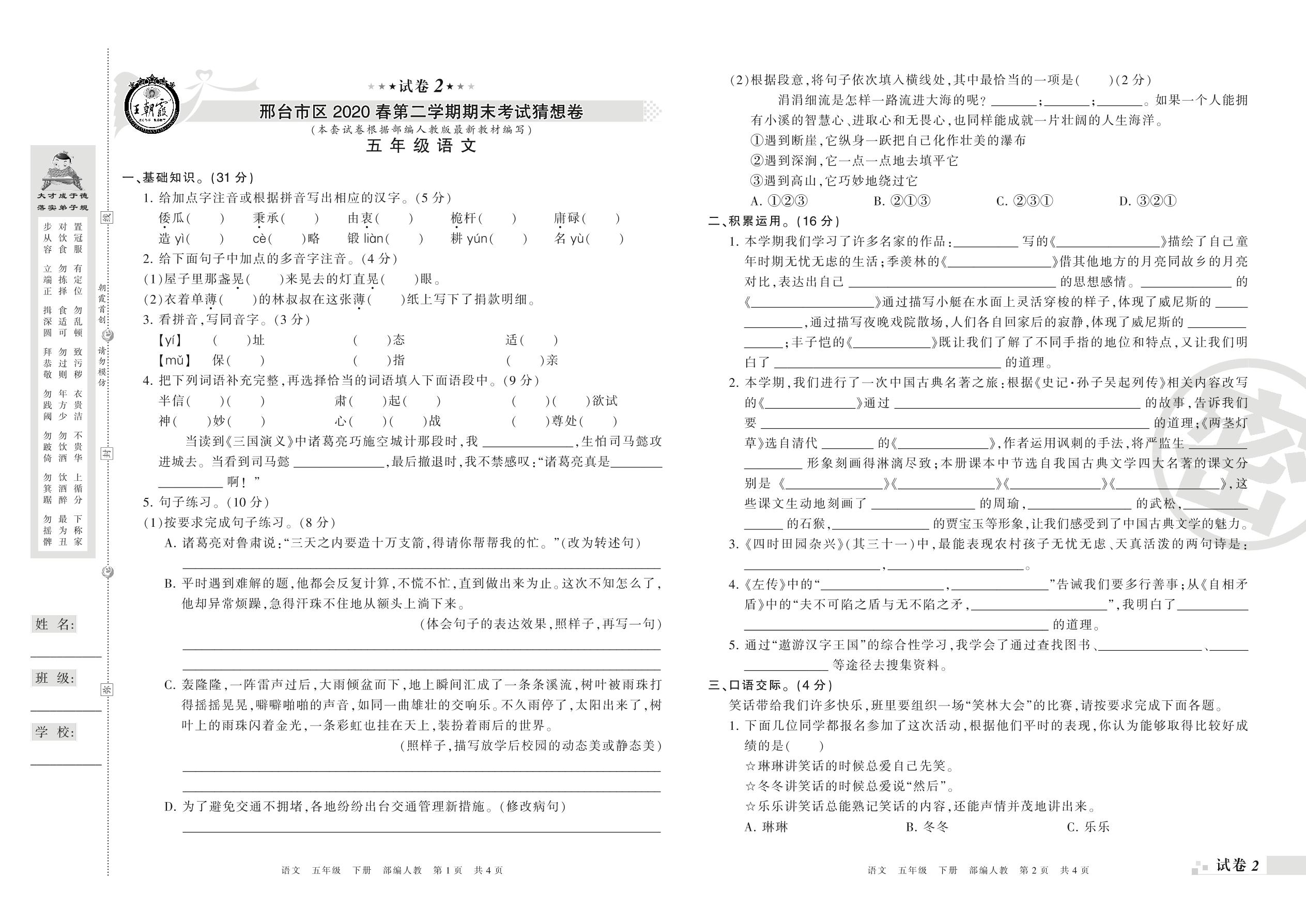 2018-2019学年第二学期邢台市区猜想卷五年级语文试卷(人教版)【2】