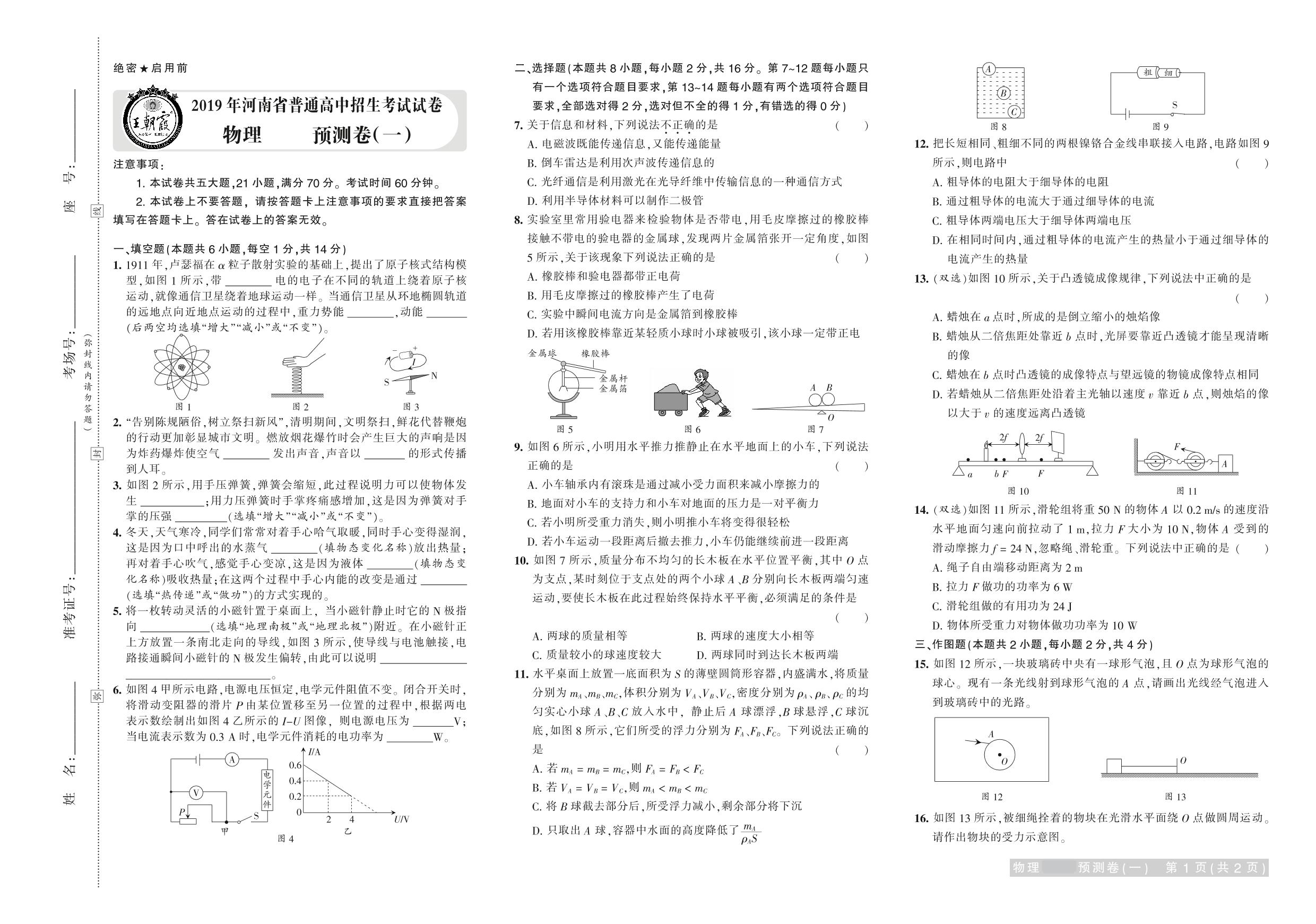 2019年河南省普通高中招生考试试卷物理·预测卷(一)