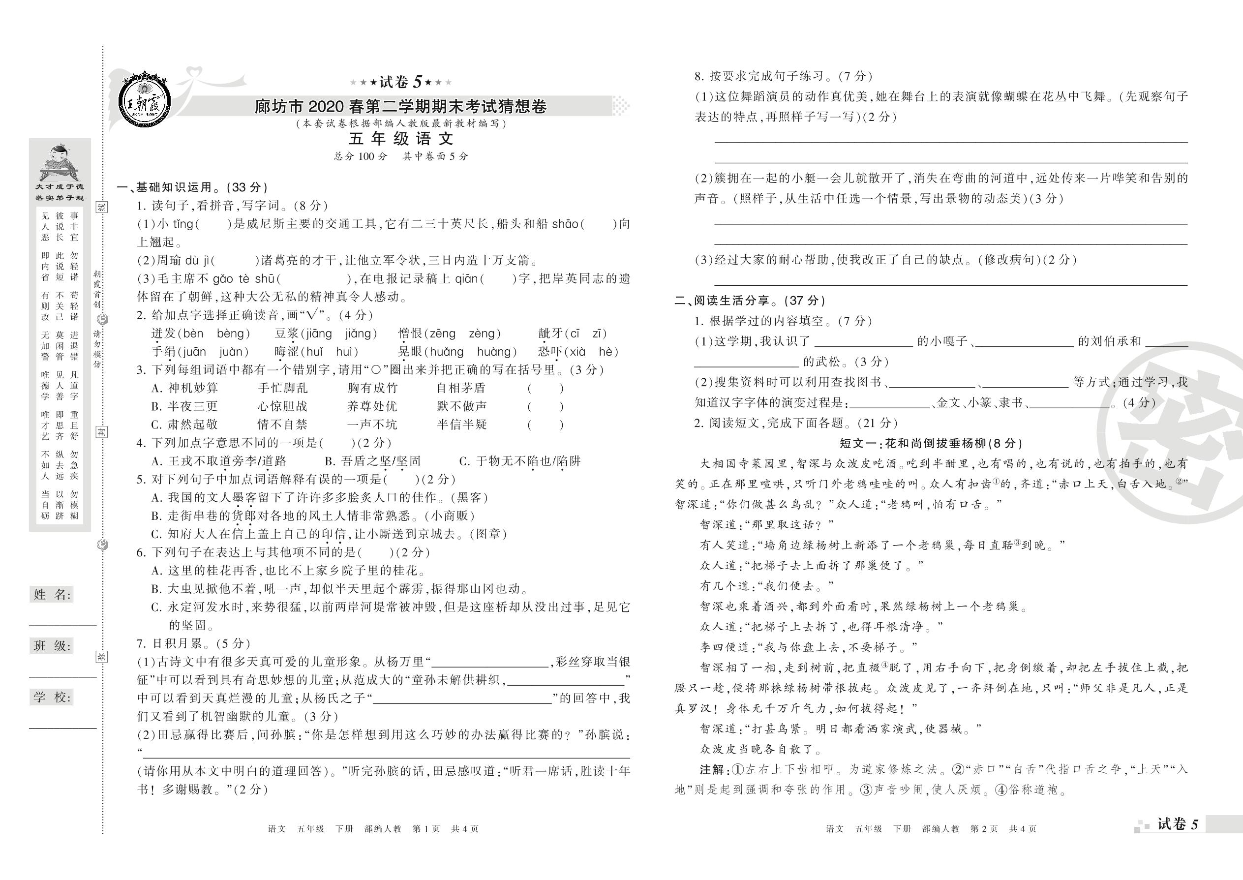2018-2019学年第二学期廊坊市猜想卷五年级语文试卷(人教版)【5】