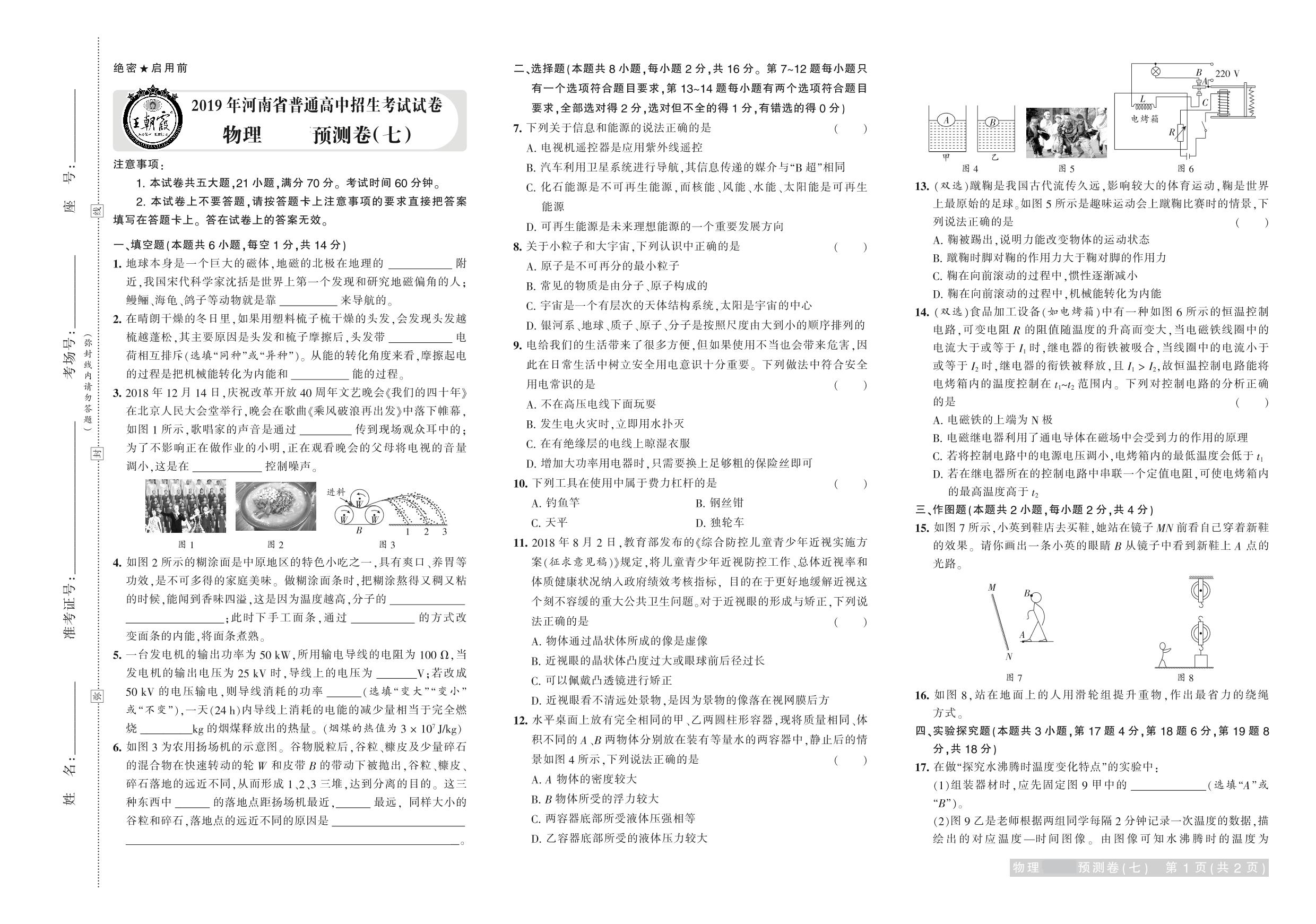 2019年河南省普通高中招生考试试卷物理·预测卷(七)