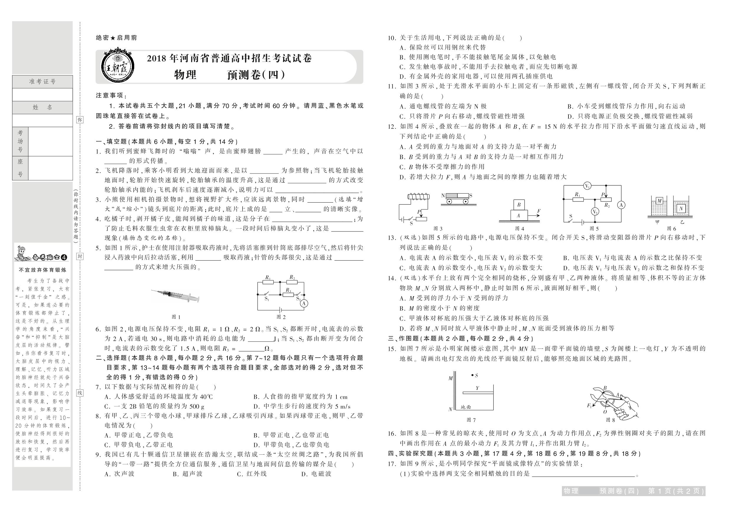 2018年河南省普通高中招生考试试卷物理·预测卷(四)