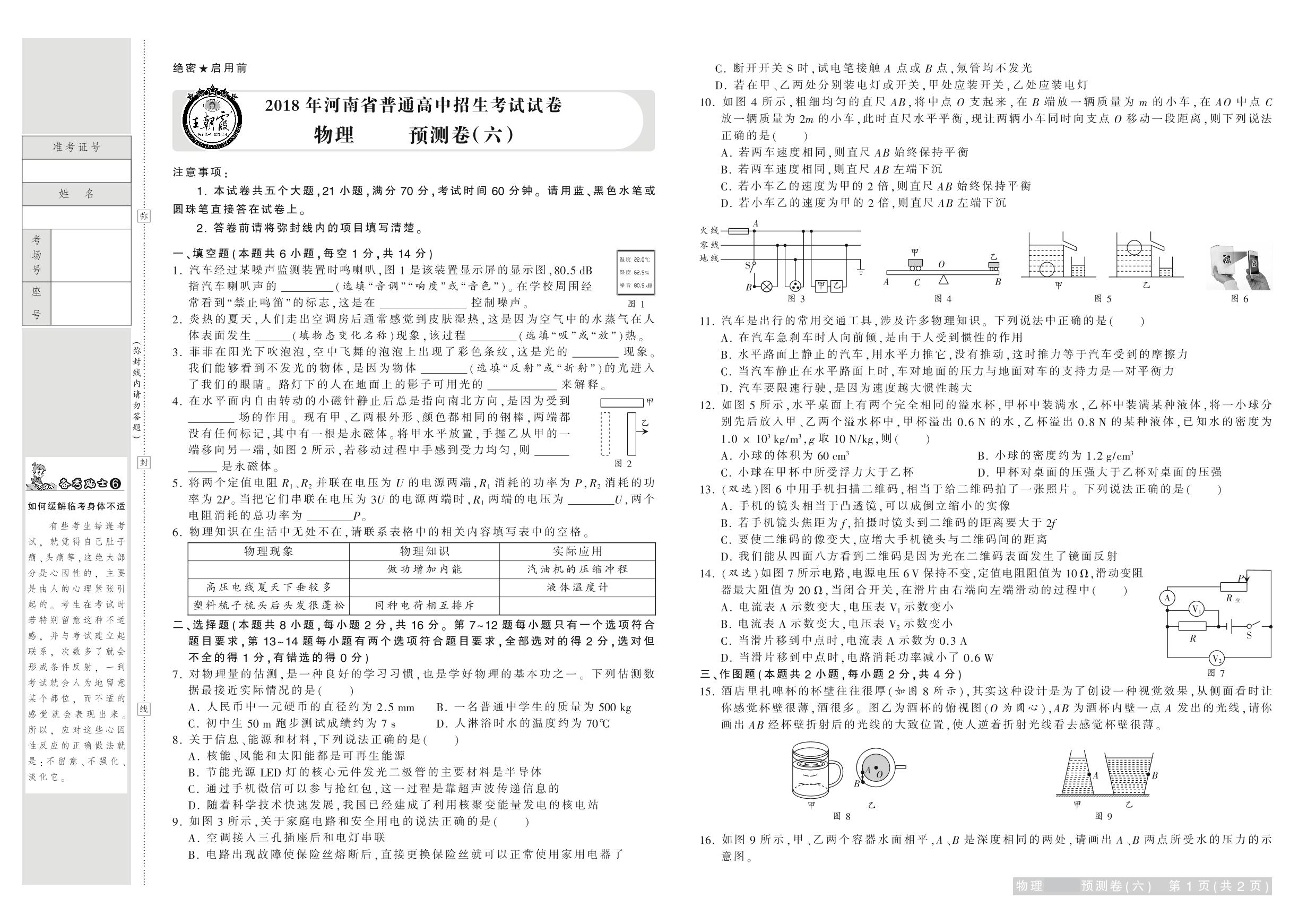 2018年河南省普通高中招生考试试卷物理·预测卷(六)