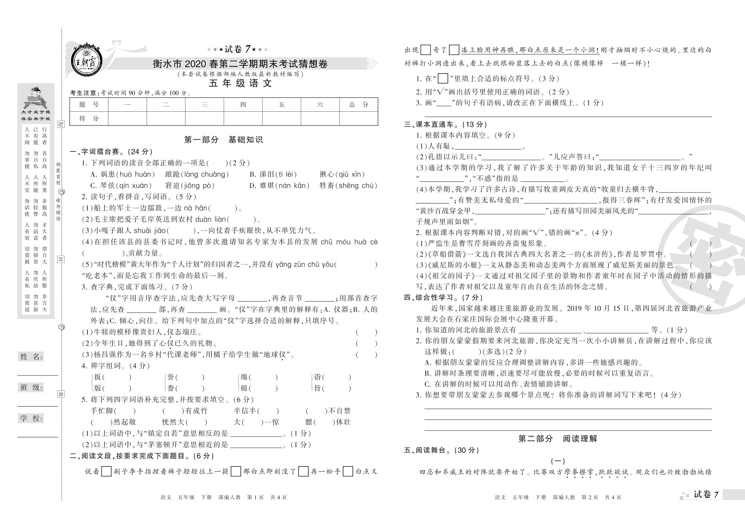 2018-2019学年第二学期衡水市猜想卷五年级语文试卷(人教版)【7】