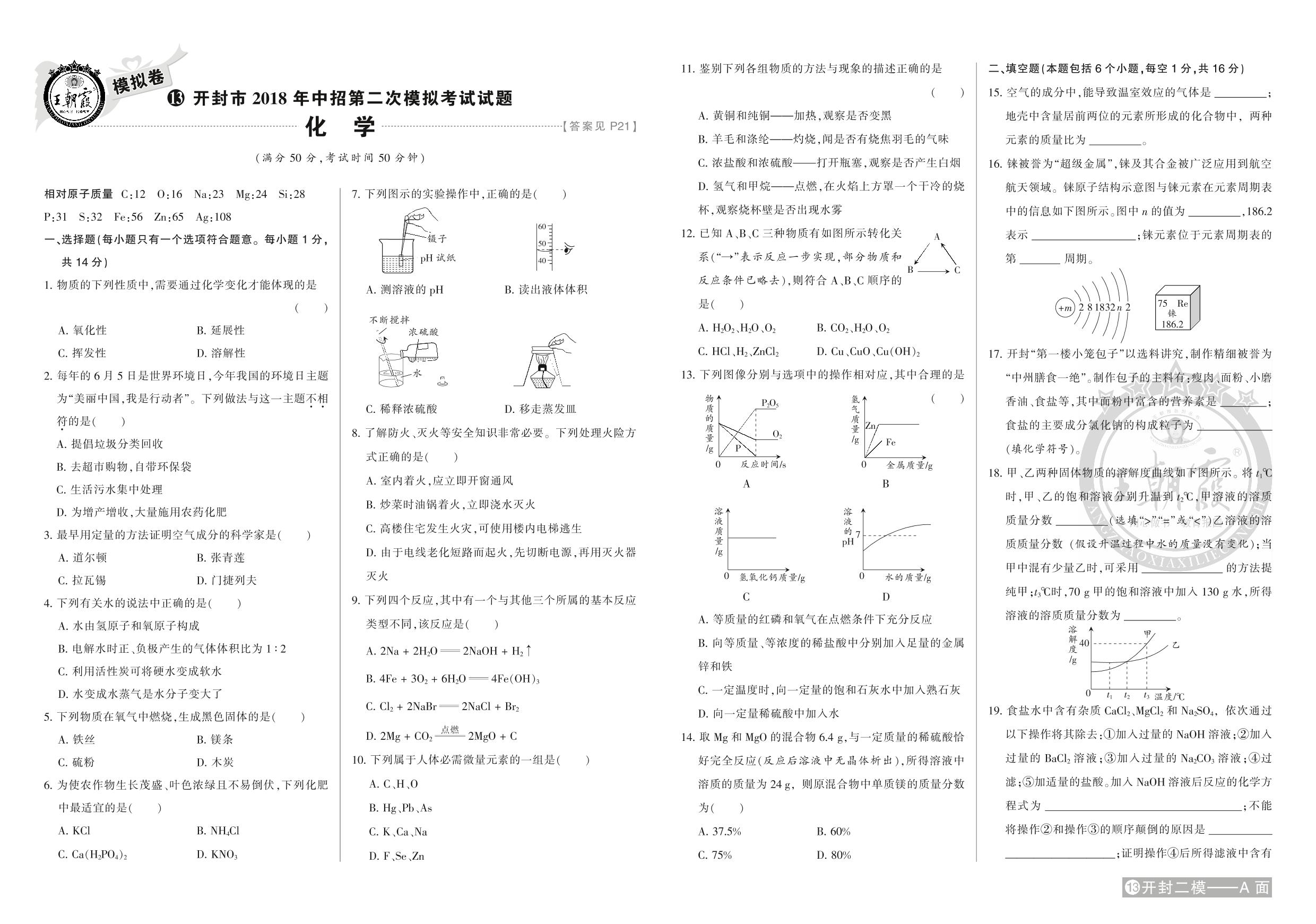 开封市2018年第二次中招模拟考试试题【13】