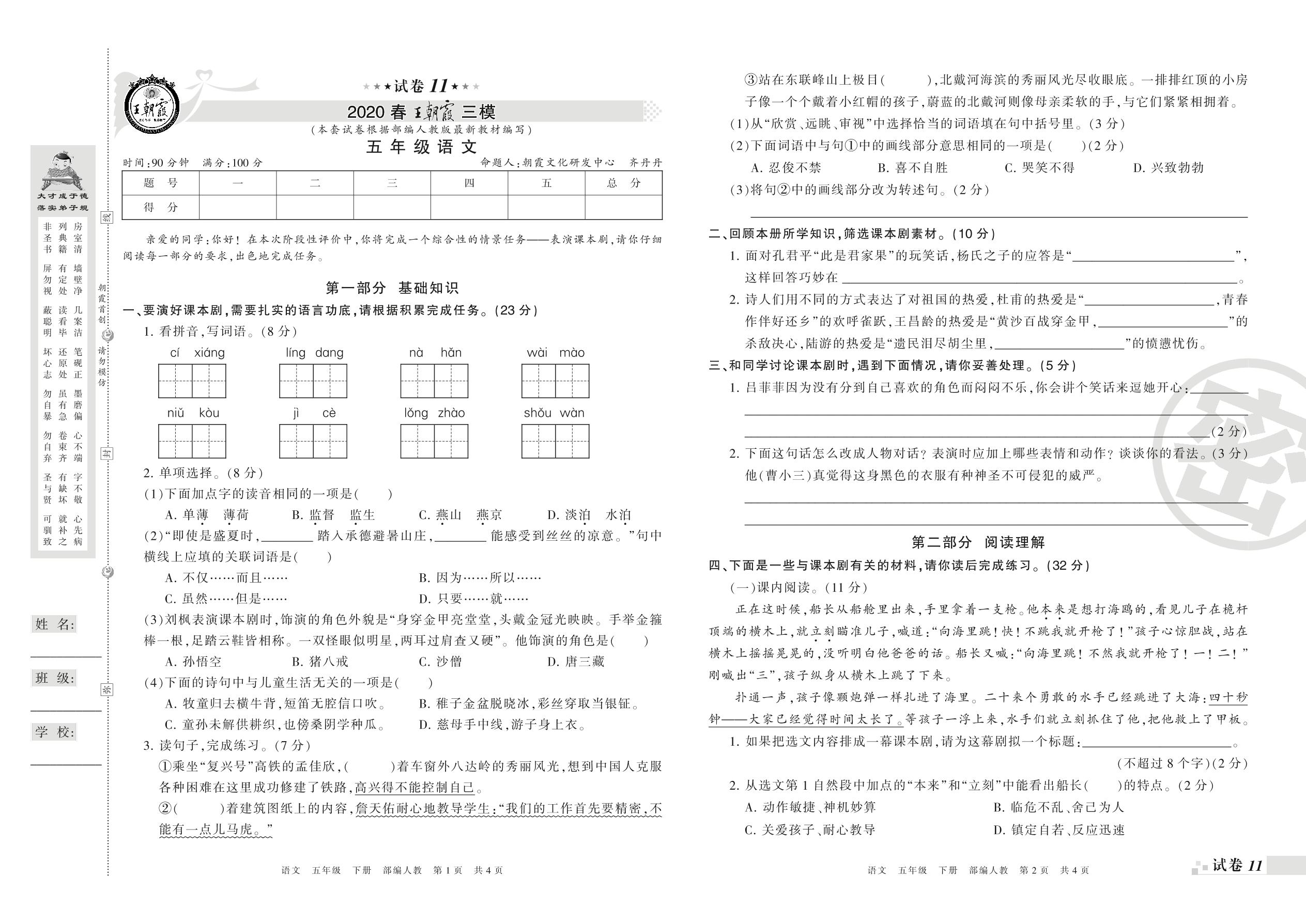 王朝霞期末模拟卷五年级下册语文(人教版)_R210801193734【11】