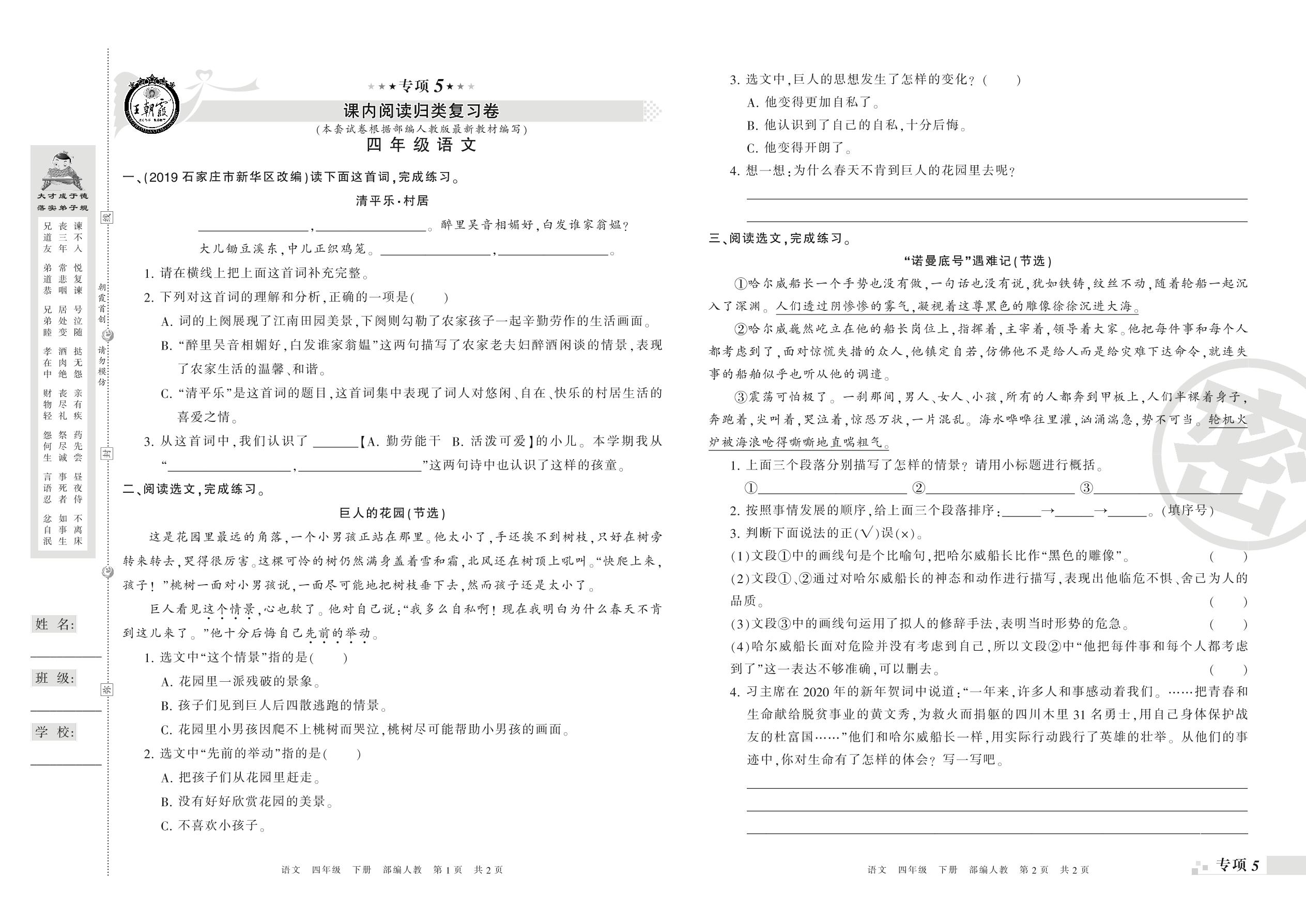 王朝霞期末专项卷——课内阅读、课外阅读真题归类复习卷四年级下册语文(人教版)_R210801193746【0】