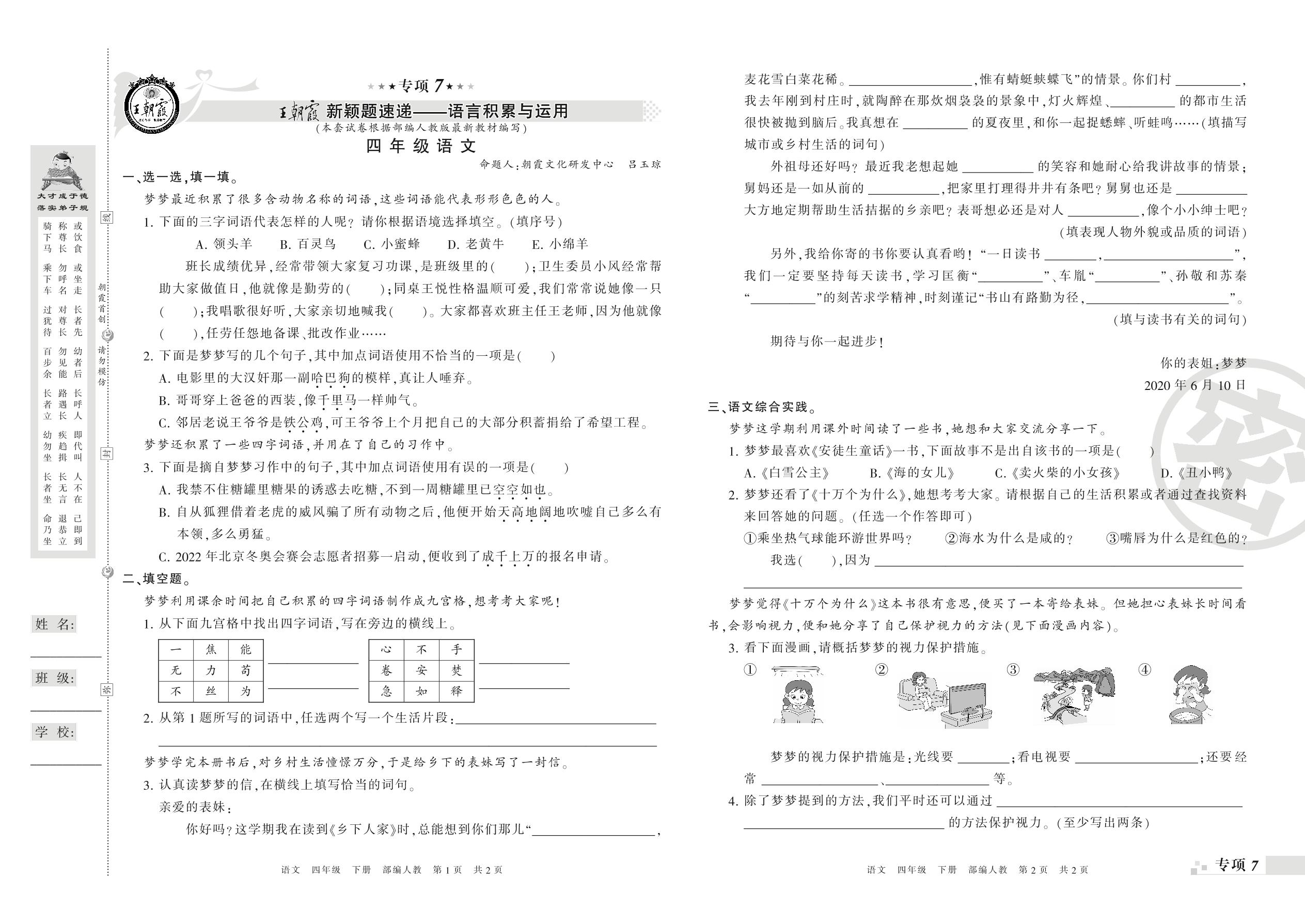 王朝霞期末专项卷——新颖题速递:语言积累与运用、非连续性文本阅读四年级下册语文(人教版)_R210801193750【0】