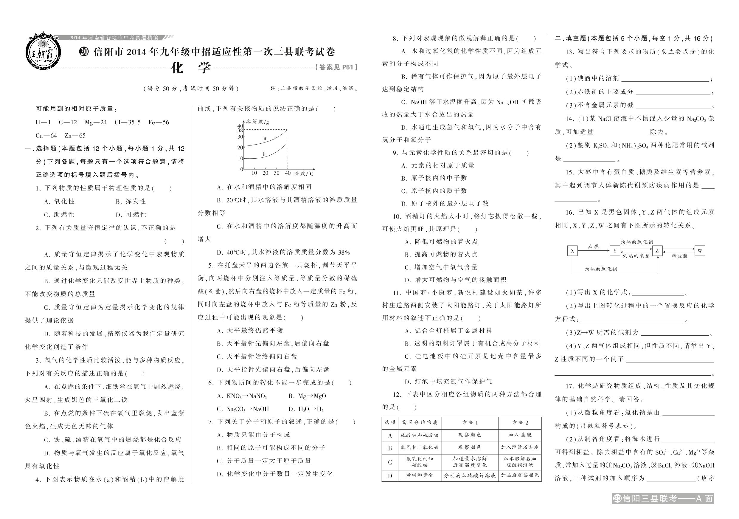 信阳市2014年九年级中招适应性第一次三县联考试卷